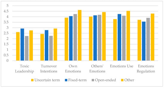 The results show that the type of employment contract is significantly associated with toxic leadership (F (3, 198) = 2.78, p = 0.042), one’s own emotions (F (3, 198) = 4.45, p = 0.005), the use of emotions (F (3, 198) = 2.77, p = 0.043), and the regulation of emotions (F (3, 198) = 2.66, p = 0.049). Participants with a fixed-term contract differ significantly in their perception of their boss’s leadership compared to those with an open-ended contract, with participants with a fixed-term contract perceiving their leader as more toxic (Figure 7). Participants with an open-ended contract have significantly lower self-emotion levels than participants with a fixed-term or other type of contract (Figure 7). Participants with another type of contract have significantly higher levels of emotion use and emotion regulation than participants with open-ended and fixed-term contracts, respectively (Figure 7).