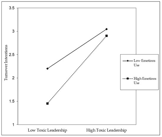 Toxic leadership is positively and significantly associated with turnover intentions only, which indicates that when employees perceive their leader as toxic, their turnover intentions increase (Table 2). The emotions of others and the use of emotions are negatively and significantly associated with turnover intentions, i.e., participants with a better appraisal of others’ emotions and higher levels of emotion use have lower turnover intentions (Table 2).