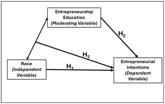 To empirically validate some of the assertions made in the extant literature in a way that is manageable, this study focuses on three variables, namely, (i) Race, (ii) Education, and (iii) Entrepreneurial Intentions. The Research Model in Figure 1 below frames the empirical research, and the Research Hypotheses stem from the Research Model.
