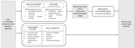 In the proposed framework, mall managers and retailers identify multiple dimensions of customer satisfaction, which is the key driver of overall customer benefit. Satisfaction relies on two main aspects: engagement factors, tied to retention-focused CRM strategies and measured through e-CRM metrics, and mall attributes related to customer attraction. The findings indicate that while mall managers prioritize customer attraction to enhance satisfaction through an appealing mall image and a well curated tenant mix, store managers focus on customer retention through long-term CRM strategies such as loyalty programs and personalized offerings and pricings. Both elements impact customer traffic, and proactive collaboration between mall managers and retailers can create synergies that improve overall mall performance.