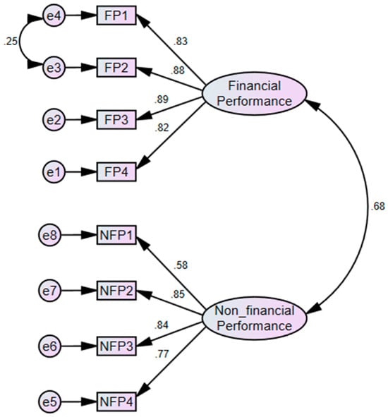 Table 4 describes the Exploratory Factor Analysis (EFA) of each item on the measurement scale, which shows that the items are grouped into two categories based on the observed variable. Furthermore, a notable difference is observed between the two factors. On the other hand, the results of the Kaiser–Meyer–Olkin (KMO) and Bartlett tests indicate a sampling adequacy of 0.8845, which is greater than 0.70, suggesting a high level of significance. The Bartlett test (Sig. = 0.000) was highly significant, allowing for factor analysis. The total variance explained in the model was 74.700%, higher than 50%, with financial performance (FP) = 59.965% and non-financial performance (NFP) = 14.735%. In this sense, it is shown that all the items were grouped according to their initial dimensions. Then, we proceeded with the Confirmatory Factor Analysis (CFA).