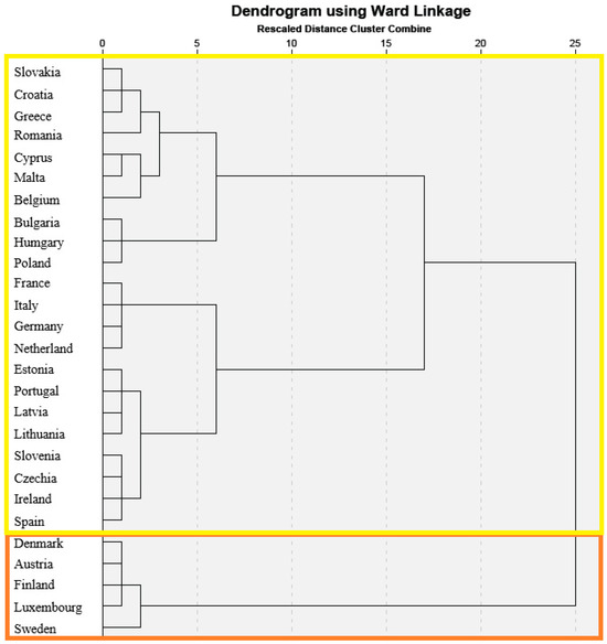 As mentioned above, the goal of this study is to investigate sustainability in EU countries through the lens of the interactions among key participants within the Quintuple Helix model. As a first step, we identified countries that are as similar as possible in relation to the examined parameters (elements) of the Quintuple Helix and at the same time as different as possible from other EU countries. To achieve this, cluster analysis was used. As mentioned above, cluster analysis is an efficient statistical method that allows the identification of natural groups (clusters) within data, whereby objects within a group show a high degree of similarity, while differences between groups are significant. In the context of evaluating the subsystems of the Quintuple Helix model, the use of cluster analysis is particularly beneficial, as it helps to reveal which countries within the European Union have similar characteristics in terms of environmental, social, economic, political, and educational factors that influence sustainability and innovation processes. This method provides the opportunity to sort countries according to complex patterns that would be difficult to capture using only individual assessments of each variable.