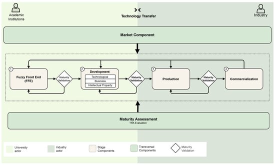 The Transversal Components, namely, the Market Transversal Component, which connects and validates product-market fit continuously to engage stakeholders throughout the innovation journey, and the Maturity Assessment Transversal Component (relevant to the idea of the validation process and continuing until the innovation is released to the Market), which systematically measures and manages the innovation maturity, maintain an ongoing relationship with the Stage Components to oversee the product’s evolution. Furthermore, Transversal Components provide feedback to Stage Components by continuously analyzing product attributes, environmental factors, and performance metrics, enabling iterative refinements that respond to evolving market needs. For instance, when a concept lacks sufficient readiness, it must return to the FFE for further research. The Maturity Validation Gates represent checkpoints for the transition between Stages, which is managed by the Maturity Assessment Component. The Academic Institutions and Industry are the principal actors (stakeholders) of the proposed framework. Universities predominantly drive research, ideation, concept design, and early-stage development, whereas Industry assumes leadership in large-scale production and market commercialization. Dynamic relationships between actors and between Components create a coordinated, iterative pathway from invention to industrial application.