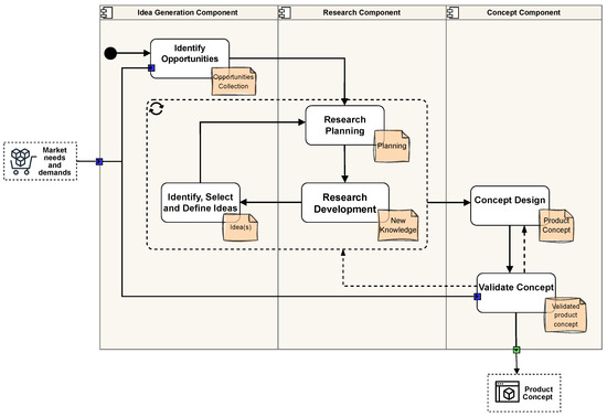 Figure 3 presents the process proposed to perform the FEE Stage Component, including the Idea Generation, Research, and Concept Definition subcomponents. The Idea Generation subcomponent comprises the activities Identify Opportunities and Identify, Select, and Define Ideas. In the first activity, opportunities are identified by exploring current market demands and needs provided by the Market Transversal Component, which are supported by academic data. Outcome-Driven Innovation, Delphi Okoli and Pawlowski (2004), and Crowdsourcing Afuah and Tucci (2012) are approaches that can help realize this activity. The Outcome-Driven Innovation framework systematically uncovers and prioritizes customer needs. The Delphi method aggregates expert consensus through a series of iterative surveys. Crowdsourcing complements these approaches by collecting information through anonymous crowds to enrich the perspective on the problem. In the second activity, ideas are identified, selected, and defined through a creative process intended to generate a wide array of potential solutions. Based on the Market Transversal Component information and knowledge derived from research results, each idea is evaluated against market viability, technical feasibility, and strategic fit criteria. During this activity, the Theory of Inventive Problem Solving (TRIZ) approach Aguilar-Zambrano et al. (2012) enables the application of patent-derived patterns to generate inventive solutions, whereas Design Thinking Liedtka and Ogilvie (2011) guides empathy-driven exploration, concept prototyping, and iterative testing, incorporating techniques such as brainstorming Paulus and Kenworthy (2019). A Political, Economic, Social, Technological, Environmental, and Legal (PESTEL) analysis Yüksel (2012) can also be used in these activities to comprehend the diverse factors that could affect the project.