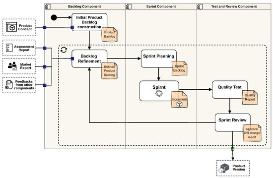 Figure 4 presents the Scrum-based process proposed to perform the Development Stage Component, including the Backlog, Sprint, and Test and Review subcomponents; we based this process on Scrum since it facilitates the product’s connection with the needs of a constantly evolving market by providing a framework for iterative and incremental development, which is functional under high uncertainty, emphasizes open stakeholder interactions for continuous feedback, and manages requirement changes at any phase Meso and Jain (2006). The aforementioned subcomponents are used to build product increments, resulting in product versions that represent the output of the Development Component.