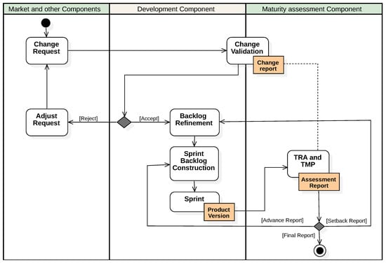 As product versions progress, an increase in TRL levels can be expected. However, stagnation and setbacks in maturity can also occur. A Maturity Setback is a regression in maturity from one period to another Szajnfarber (2014) that can occur due to changes for new revisions and discoveries or in response to a development strategy Szajnfarber (2014); it does not represent a negative aspect of the development but refers to a natural and necessary part of the development process of complex systems that obey innovation’s cyclical and interconnected nature. Managing Maturity Setbacks is essential for innovation to mature correctly. Figure 6 presents in an activity diagram of the process proposed to handle a Setback, involving (i) The Market Transversal Component or any Stage Component that originates the Setback. By initiating a formal notification of a change from one of these components, potential obstacles in the innovation are identified early. When a change requirement is rejected, the reasons are communicated to the requesting Transversal or Stage Component so that the change proposal can be refined. (ii) Once a change requirement is accepted, the Development Stage Component is responsible for managing the Setback by performing Backlog Refinement, Backlog Construction, and Sprint running, which could embrace adding or re-prioritizing user stories and tasks. (iii) The Maturity Assessment Component that identifies the Setback via the above-mentioned TRA and TMP reports. It is essential to highlight, first, that the Development and Maturity Assessment teams must work collaboratively to validate technical feasibility and long-term maturity benefits before advancing in any product change. Second, the Maturity Assessment Transversal Component prepares a change report, trying to forecast potential maturity setbacks.