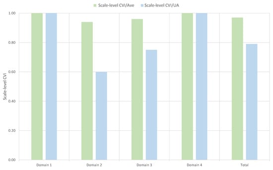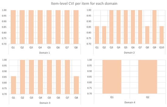 Table 4 summarizes the results of the Item-level CVI and for all items, and Figure 7 shows them by domain. The results revealed that the Scale-level CVI/UA was 79% (unanimity in 22/28 items—narrowly below the desired threshold of 0.80). Complete agreement was observed in Domains 1 and 4, confirming their relevance for the instrument, while Domain 2 exhibited a perfect score in 6 of 10 items (60%), evidencing divergent expert views regarding this domain. The items without unanimity attained an Item-level CVI of 0.86, exceeding the minimum threshold of 0.83, indicating that only one of the seven experts rated those items as insufficiently relevant and confirming high item validity. In Domain 3, two items scored 0.86, while the remainder scored 1.00, indicating that most of them were unanimously judged as relevant. Overall, items with unanimous agreement yielded . The remaining items produced . At the domain level, the minimum kappa was obtained by Domain 2 and Domain 3, both with 0.85. The acceptability threshold is ; therefore, all items exceed the recommended cut-off, indicating substantial to excellent agreement. These kappa results corroborated the Item-level CVI findings and strengthen the conclusion that the instrument items were judged as relevant.