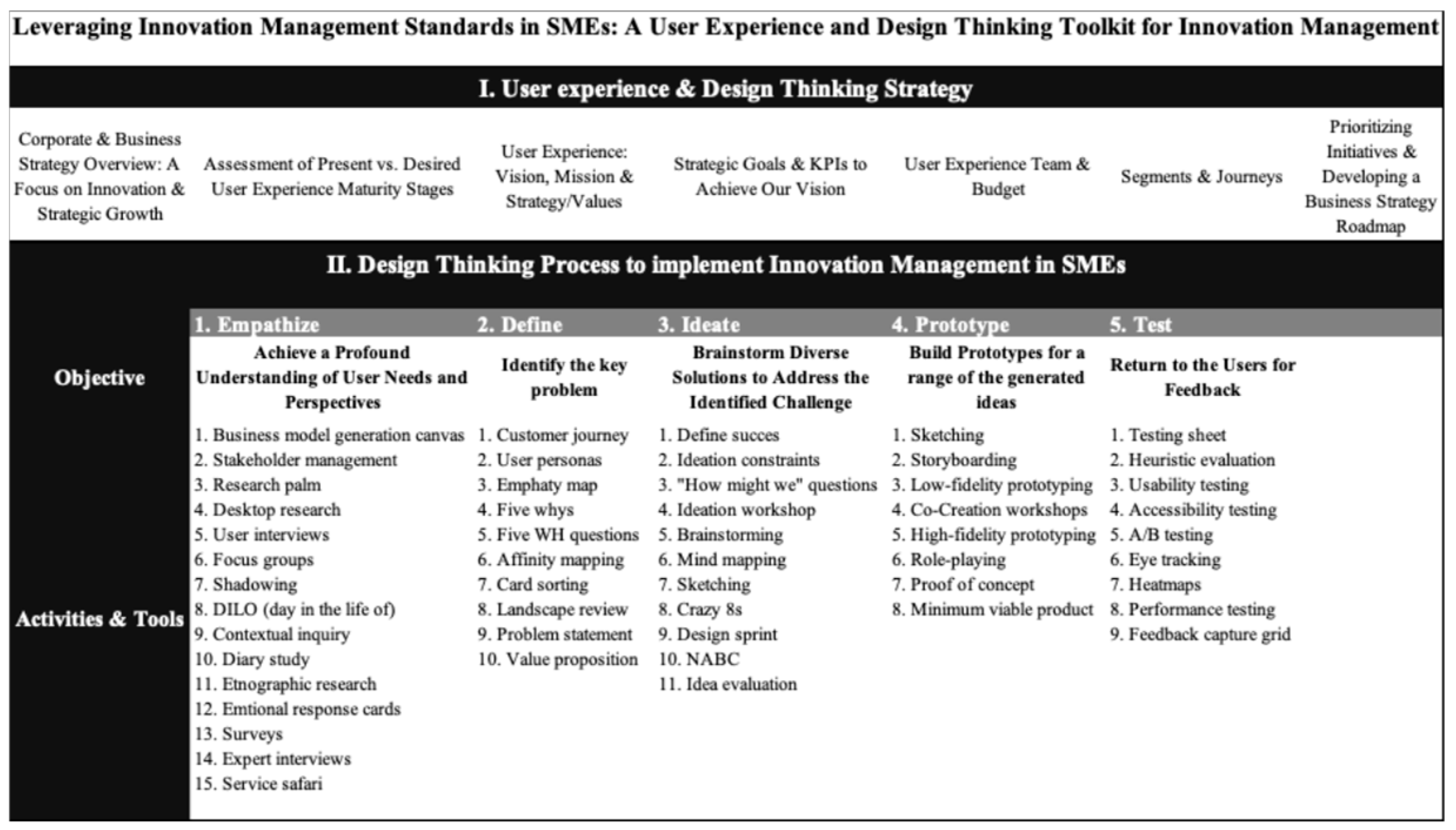 This research contributes to the field by offering a practical, ISO-compliant framework for operationalizing design thinking in SMEs to enhance sustainable innovation and strategic alignment.