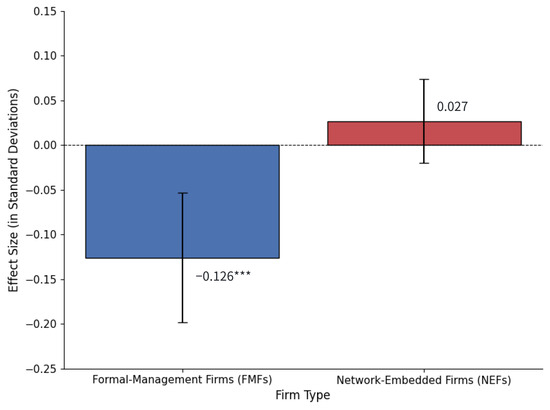 In stark contrast, for formal management firms (FMFs), the coefficient of managerial presence is −0.126 and is statistically significant at the 1% level. This indicates that directive supervision significantly enhances productivity in these hierarchical organizations, reducing the standardized completion time by 0.126 standard deviations (a 4.3 s or 2.8% improvement). This suggests that in organizational contexts characterized by arm’s-length employment relationships and formal hierarchies, directive supervision functions as an essential governance mechanism that complements the firm’s bureaucratic structure.