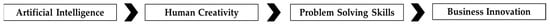 Visual conceptual model illustrating the directional relationship between Artificial Intelligence, Human Creativity, Problem-Solving Skills, and Business Innovation. Arrowheads indicate the flow of influence and progression among the components.