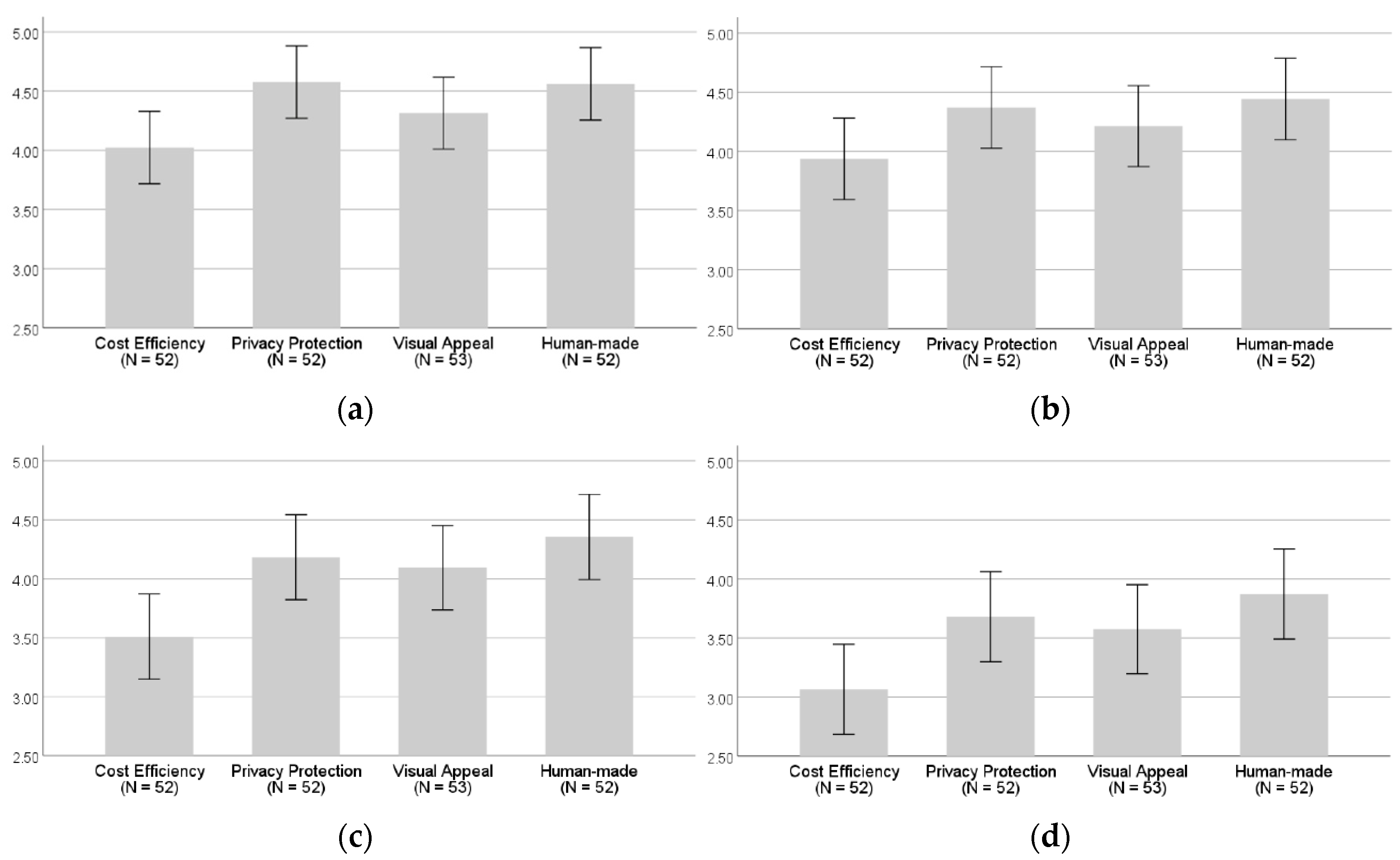 Variables | Classifications | Human-Made (N = 52) | Privacy Protection (N = 52) | Visual Appeal (N = 53) | Cost Efficiency (N = 52) | ||||