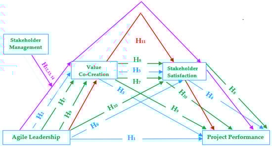 Stakeholder management moderates the sequential mediation of value co-creation and stakeholder satisfaction between agile leadership and project performance, such that stakeholder management strengthens the sequential mediation of value co-creation and stakeholder satisfaction between agile leadership and project performance. The theoretical framework developed based on the above literature is presented in Figure 1.