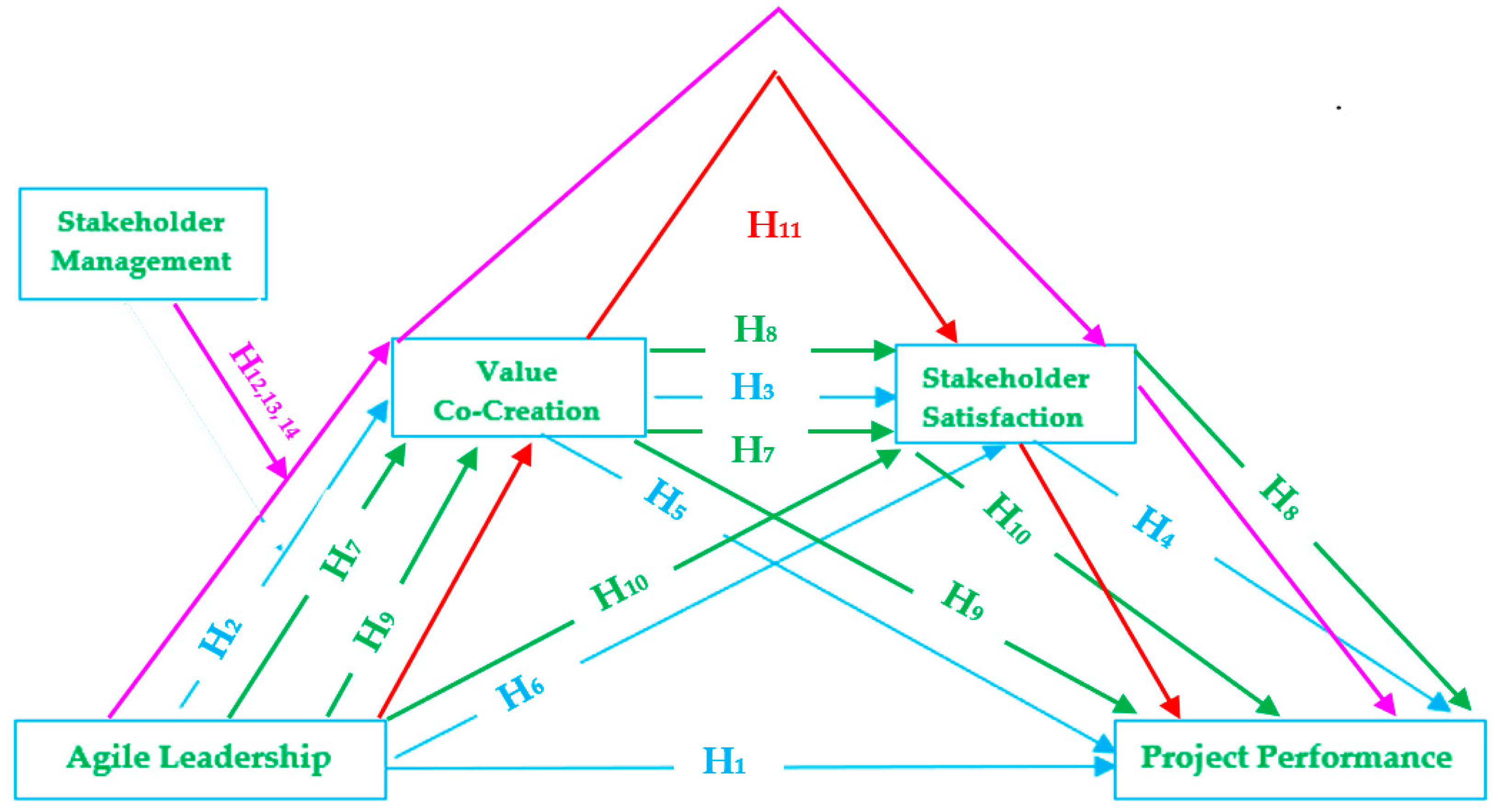 Khan, M.I.; Bangash, B.S.; Shah, S.A.M.; Shakoor, H.; Fatima, N.; Seraj, A.H.A.; Afaneh, J.A.A. Leaders, Let’s Get Agile: Examining Project Performance Through Sequential Moderated Mediation of Value Co-Creation and Stakeholder Satisfaction Using the Lens of Agile Leadership. Adm. Sci. 2025, 15, 407. https://doi.org/10.3390/admsci15110407