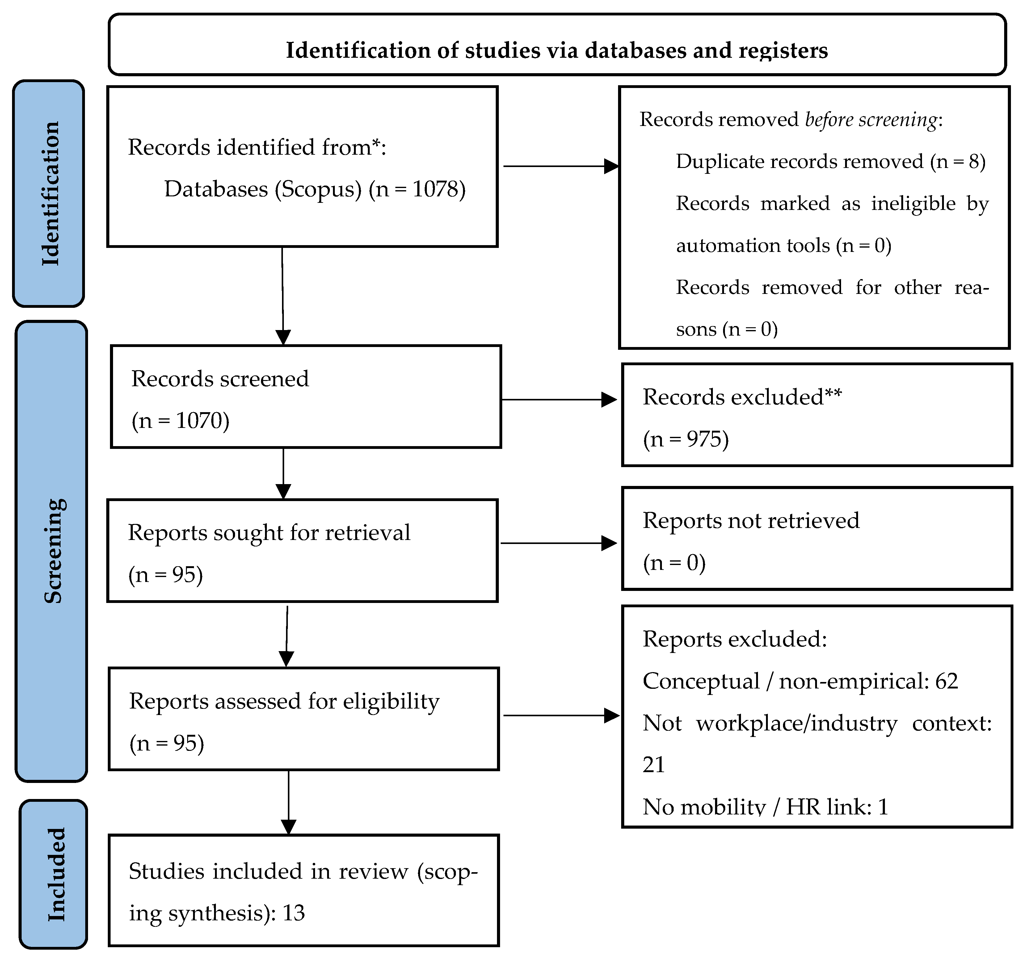 Munn et al., 2018). A scoping review was therefore selected because research on workplace language policies, proficiency, and career mobility remains fragmented across disciplines (management, HRM, applied linguistics), with diverse study designs that preclude meta-analysis. The review aimed to map empirical evidence on how workplace language regimes affect employee mobility and organisational practices.