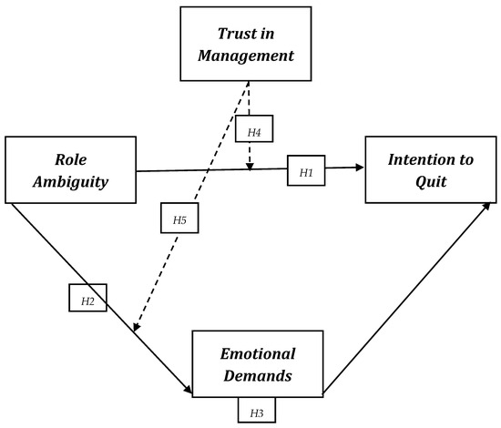 Institutional trust in management within the Lesotho public sector is frequently contested due to perceptions of limited transparency, favoritism in promotions, and inconsistent decision-making (World Bank, 2021). This sector is significant as it is a large employer and its practices often influence other sectors in the country. This makes it an ideal setting to test the role of trust in management as a moderating resource. By situating the study in such a trust-sensitive context, the analysis can reveal valuable insights into how managerial credibility mitigates (or fails to mitigate) the harmful effects of role ambiguity. Therefore, this research, however, takes a novel approach by examining the impact of trust in management, role ambiguity, and emotional demand on intentions to quit. By introducing this unique perspective, we aim to contribute to the existing literature and stimulate further research in this area by stating the following hypotheses: