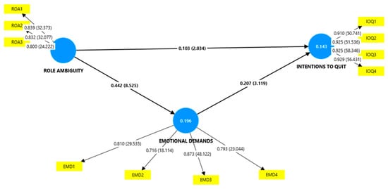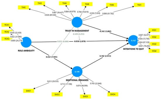 Finally, the PLS-SEM, with its robustness and adaptability, is particularly suitable for predictive, theory-building purposes with complex models, mixed measurement types (reflective/formative), and distributional deviations. Its adaptability ensures that it can be applied to a wide range of research scenarios, making it a versatile tool for researchers. It also manages modest to moderate sample sizes, which are common in single-industry field research. Therefore, a two-stage approach—(1) measurement model assessment and (2) structural model estimation with bootstrapping for inference—was adopted in this study, ensuring the most appropriate and effective research approach. The study’s findings, which will be discussed in detail in Section 4, are expected to provide valuable insights into the relationship between trust in management, role ambiguity, emotional demands, and intentions to quit, and their implications for organizational management and employee well-being.
