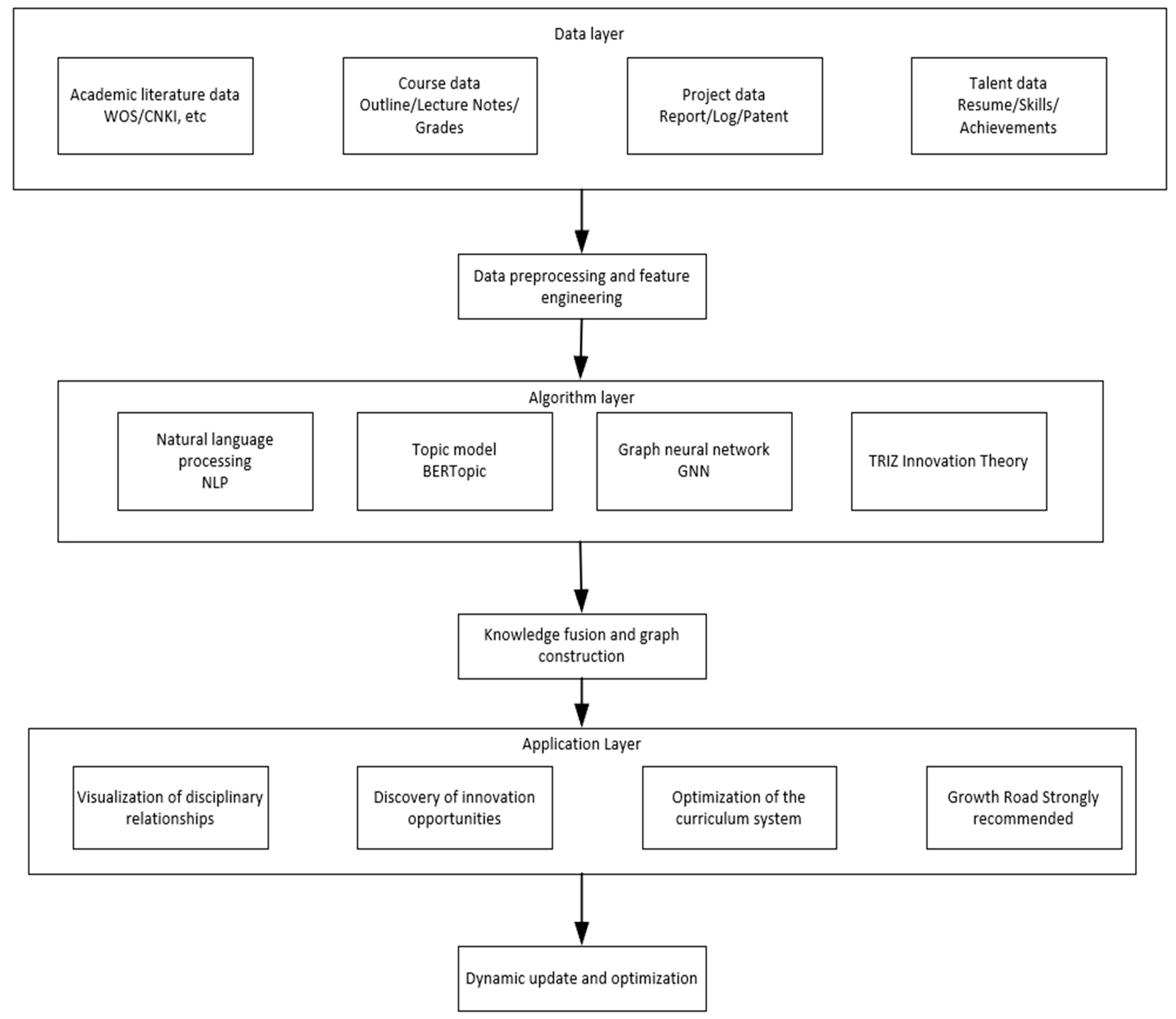 | 1. Knowledge integration degree | 1.1 Breadth and depth of interdisciplinary integration | Knowledge graph analysis: Generate an individual knowledge graph based on course grades, literature reading, and project reports and compare its similarity with the target knowledge graph. |