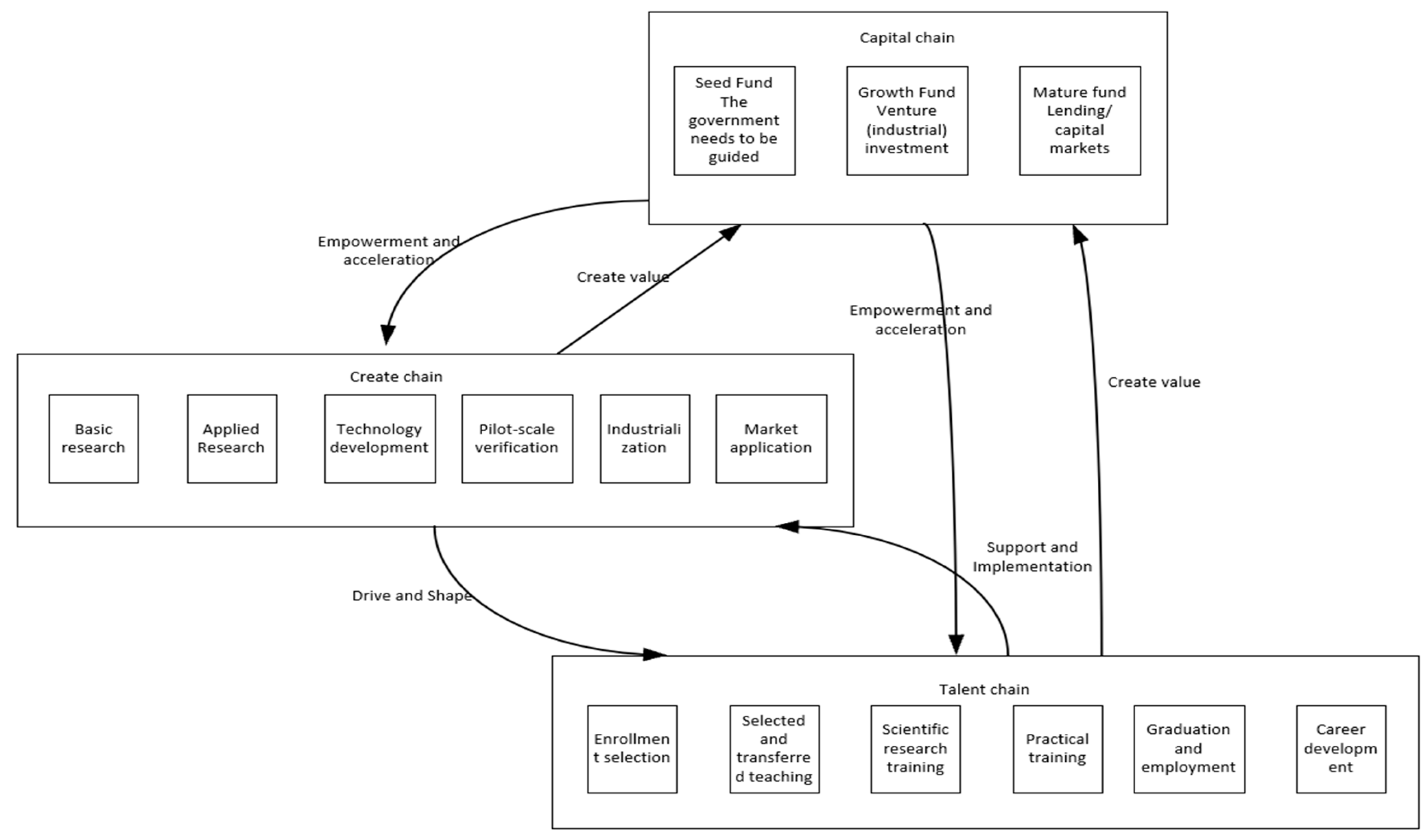 | Financial Institutions (F) | Value Discoverer and Risk-sharer | Financial Capital: In the forms of venture capital, achievement transformation funds, etc., it provides capital for high-potential projects and “prices” technology routes and talent value through market-oriented decision-making. |