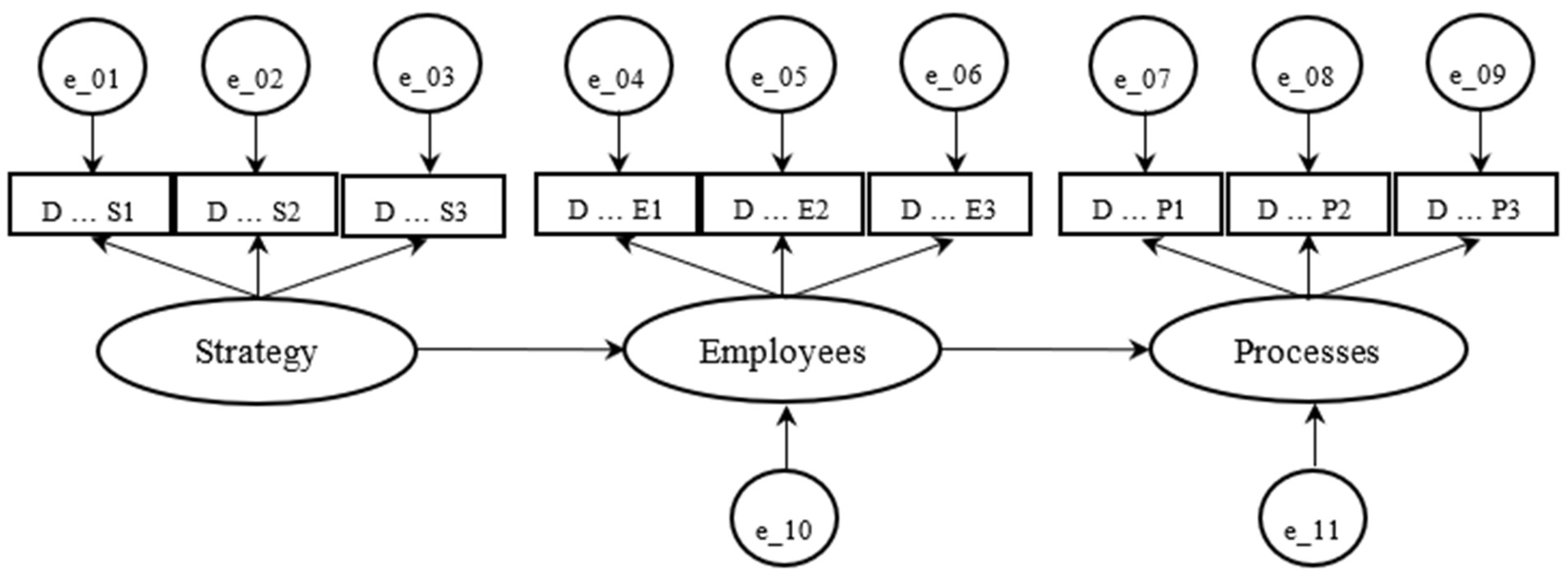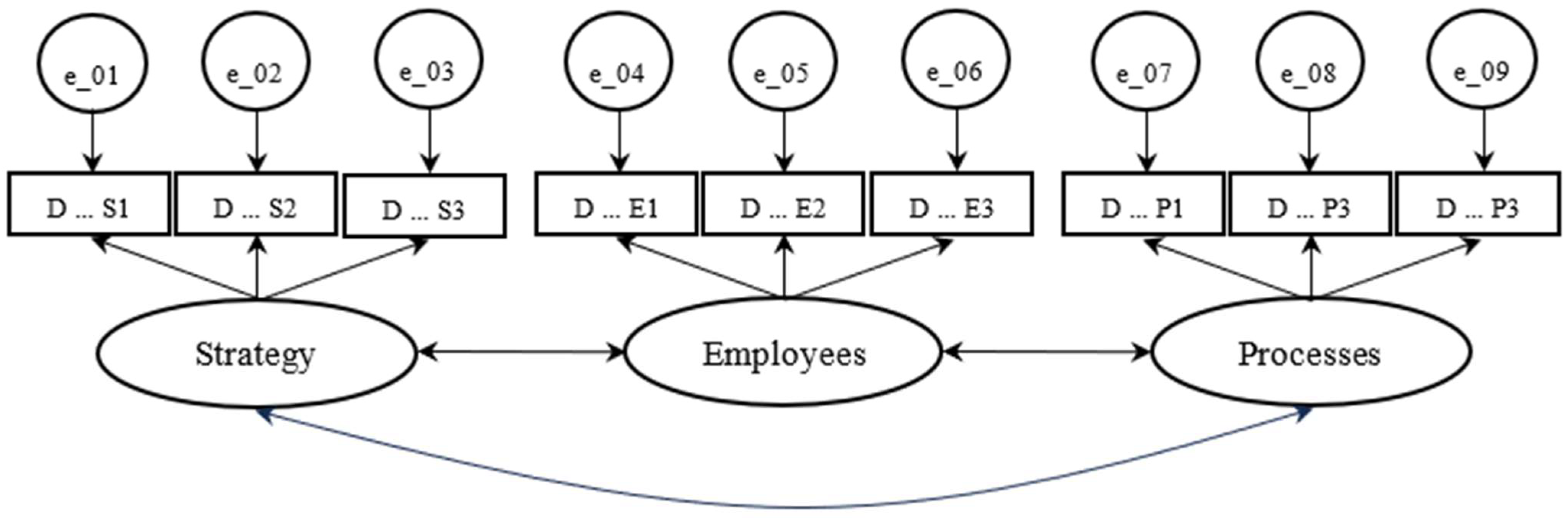- Digital Adaptation (Ada) involves proactive learning and incremental innovation (Fägerlind & Saha, 2016). Strategy dimension’s items (DAdaS1–DAdaS3) reflect openness to new solutions; Employees’ items (DAdaE1–DAdaE3)—on autonomous skill development; Processes’ items (DAdaP1–DAdaP3) on collaborative goal-setting and iterative learning. The items move beyond continuity to emphasize learning, openness to new tools, and proactive improvement. This resonates with the resilience strategy of “bouncing forward,” where crises accelerate adaptive changes in organizational routines (Manyena et al., 2011).