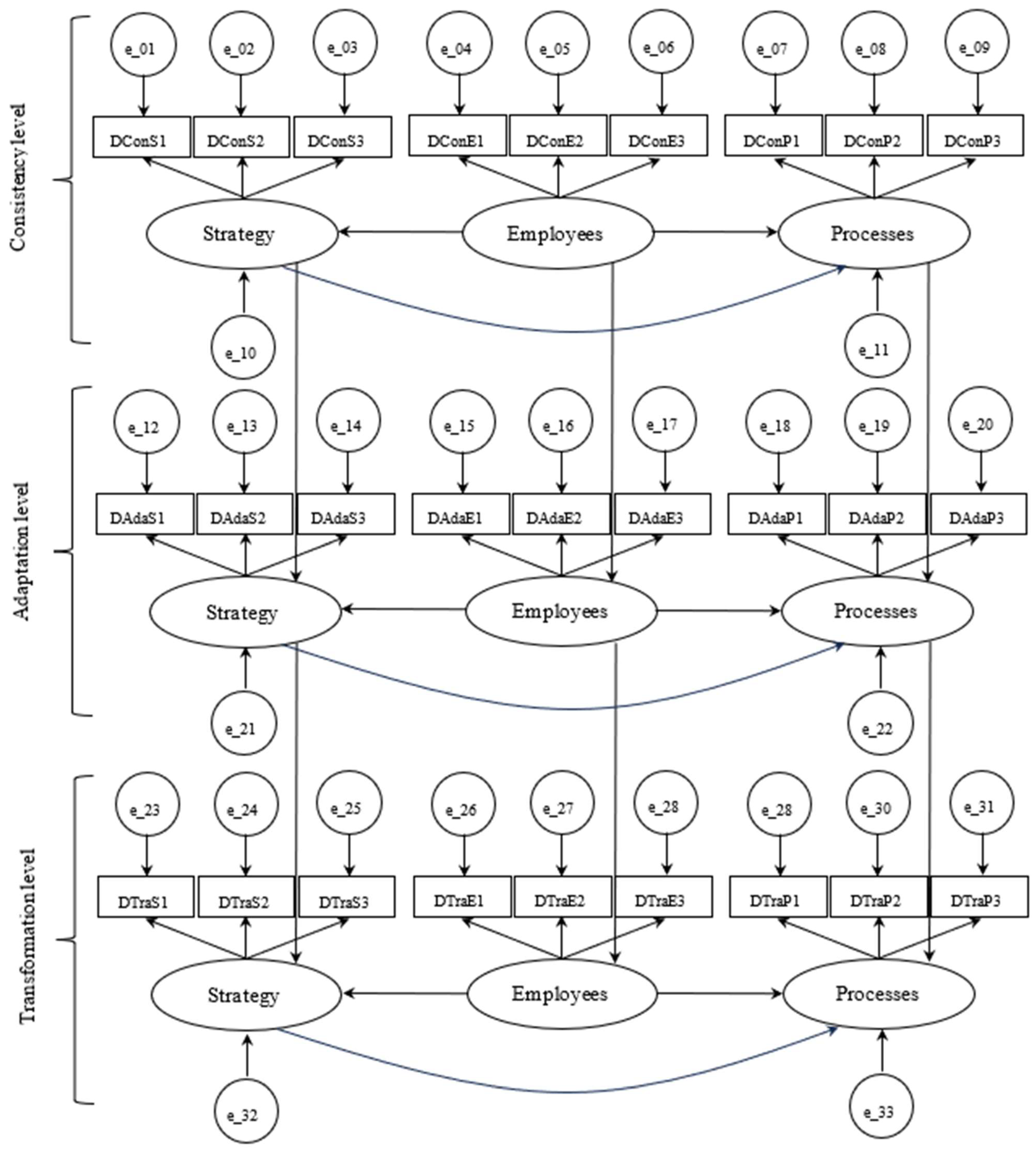 - Digital Transformation (Tra) is the highest maturity level, aiming to pioneer solutions (Mergel, 2016) and embrace high level municipal resilience (Taleb, 2012). Strategy’s items (DTraS1–DTraS3) focus on innovative service models and emerging technologies; Employees’ items (DTraE1–DTraE3)—on shared leadership and active participation; Processes’ items (DTraP1–DTraP3)—on redesigning workflows and citizen-centric e-services. Organizations adapt and reconfigure to sustain digital growth. Items emphasize structural and cultural shifts where digital initiatives drive fundamental organizational changes, thereby cultivating innovation-oriented practices that thrive on disruption rather than merely withstand it.