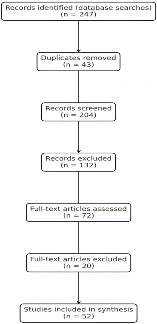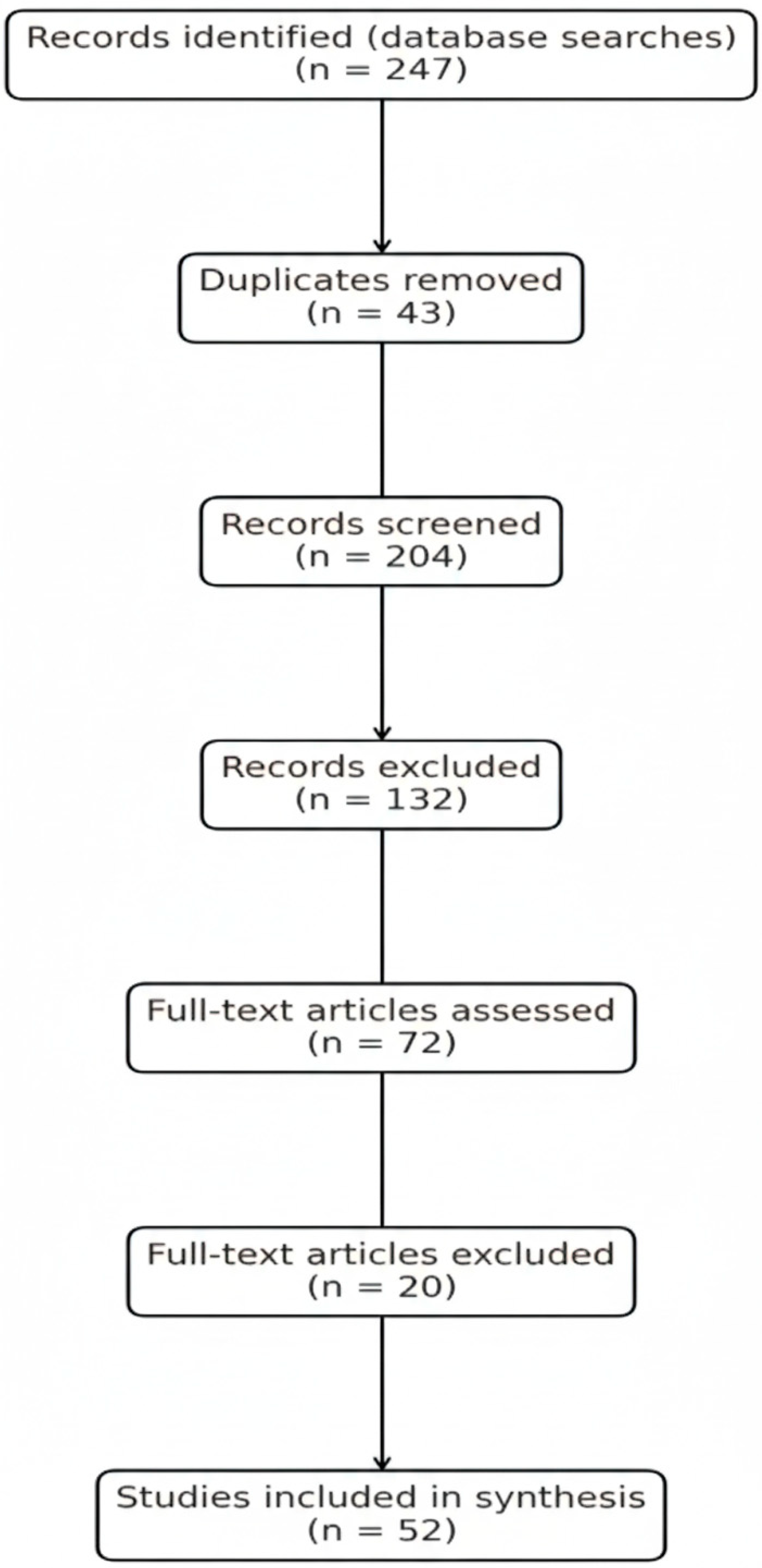 A total of 247 records were identified. After removing duplicates and applying inclusion/exclusion criteria, 52 articles were included in the final synthesis. Data were extracted on year, geographic context, methodology, technology focus, and key findings. The synthesis followed a thematic approach, identifying trends in digital marketing, AI, open data, collaborative tools, and governance challenges.