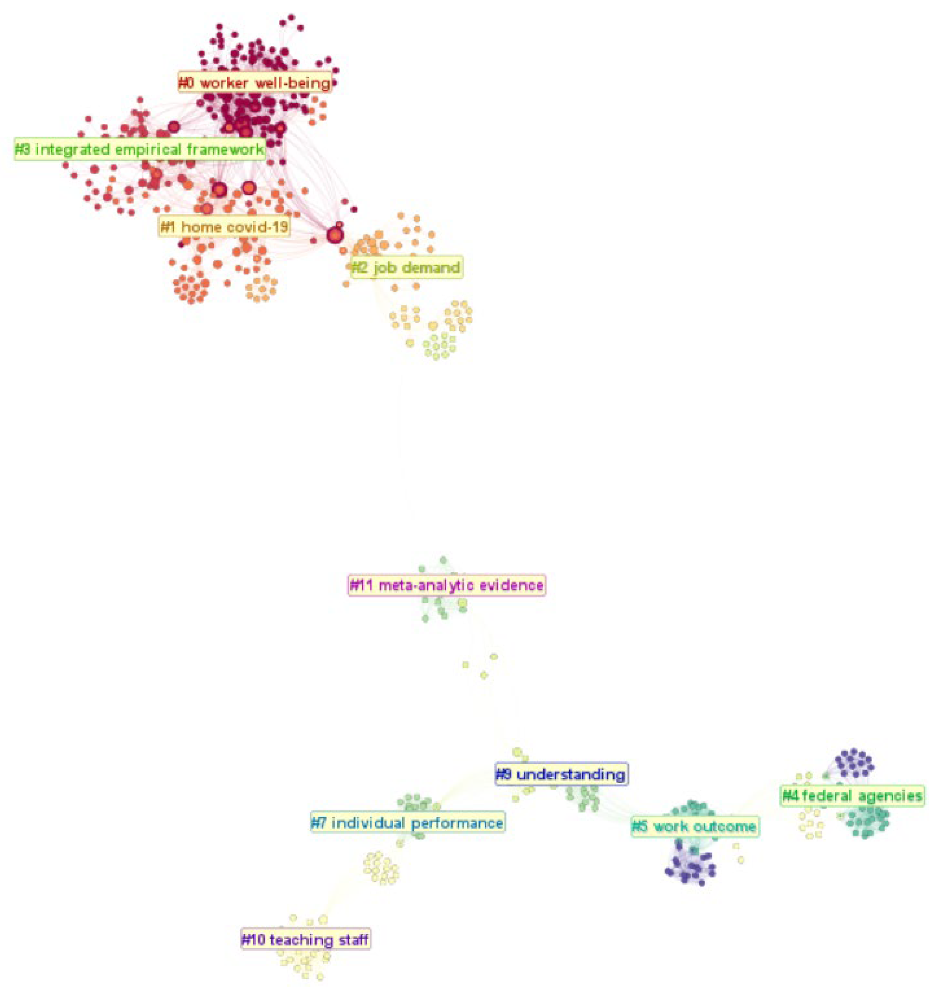 The top-ranked item by citation counts is nakrosiene a, 2019, working from home: characteristics and outcomes of telework @ international journal of manpower, v40, p87–101 in cluster #0, with citation counts of 9. the second one is belzunegui-eraso a, 2020, teleworking in the context of the COVID-19 crisis @ sustainability, v12, p9 in cluster #2, with citation counts of 9. the third is charalampous m, 2019, systematically reviewing remote e-workers’ well-being at work: a multidimensional approach @ european journal of work and organizational psychology, v28, p51–73 in cluster #1, with citation counts of 8. the fourth is karacsony p, 2021, impact of teleworking on job satisfaction among slovakian employees in the era of COVID-19 @ problems and perspectives in management, v19, p1–9 in cluster #0, with citation counts of 6. the fifth is kazekami s, 2020, mechanisms to improve labor productivity by performing telework @ telecommunications policy, v44, p2 in cluster #1, with citation counts of 6. the sixth is song y, 2020, does telework stress employees out? a study on working at home and subjective well-being for wage/salary workers @ journal of happiness studies, v21, p2649–2668 in cluster #0, with citation counts of 5. the seventh is ipsen c, 2021, six key advantages and disadvantages of working from home in europe during COVID-19 @ international journal of environmental research and public health, v18, p4 in cluster #0, with citation counts of 5. the eighth is vyas l, 2021, the impact of working from home during COVID-19 on work and life domains: an exploratory study on hong kong @ policy design and practice, v4, p59–76 in cluster #3, with citation counts of 5. the ninth is kniffin km, 2021, COVID-19 and the workplace: implications issues and insights for future research and action @ american psychologist, v76, p63–77 in cluster #0, with citation counts of 5. the 10th is carnevale jb, 2020, employee adjustment and well-being in the era of COVID-19: implications for human resource management @ journal of business research, v116, p183–187 in cluster #3, with citation counts of 5.