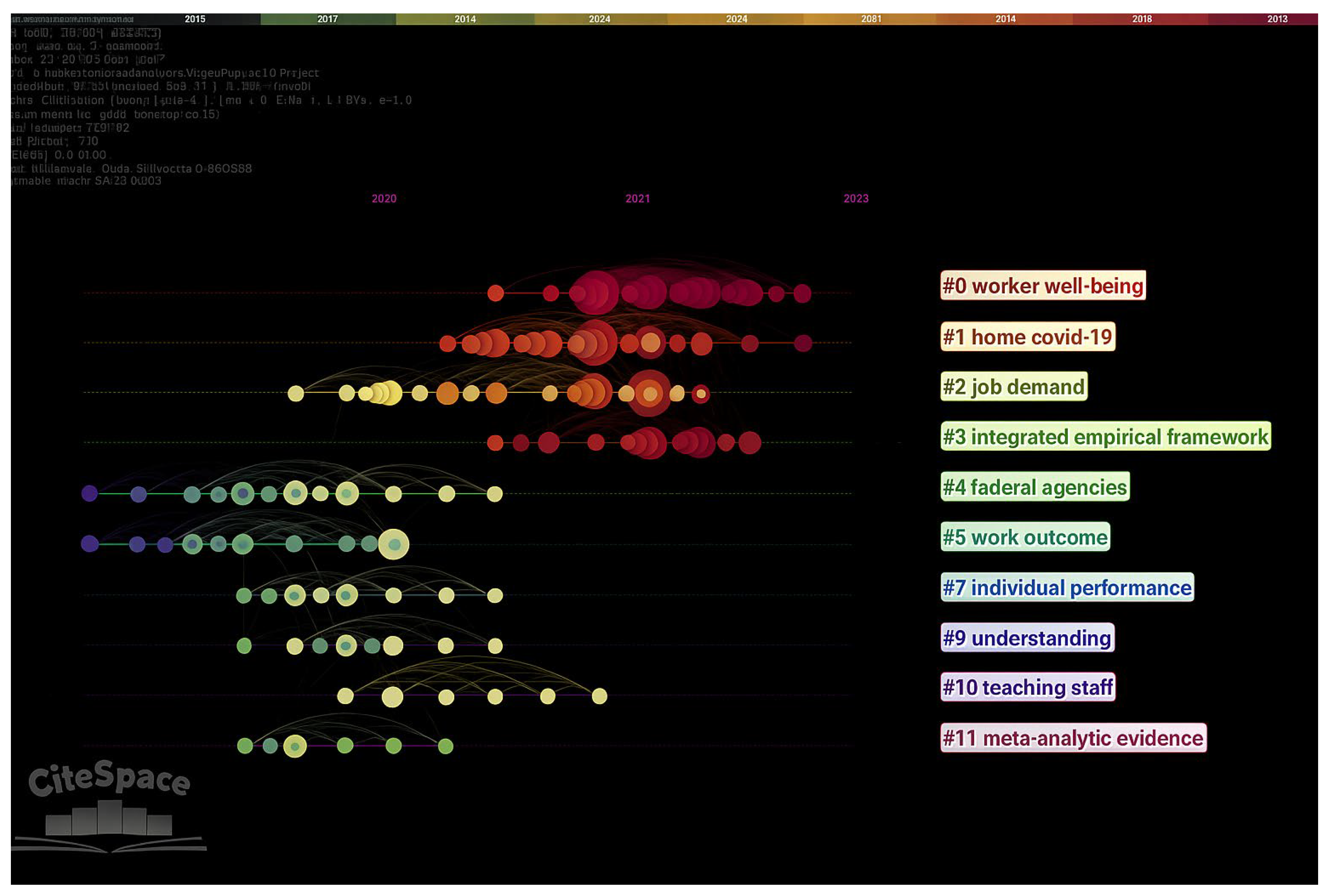 The top-ranked item by bursts is Nakrosiene A, 2019, WORKING from home: characteristics and outcomes of telework @ international journal of manpower, v40, p87–101 in cluster #0, with bursts of 0.00. the second one is belzunegui-eraso a, 2020, teleworking in the context of the COVID-19 crisis @ sustainability, v12, p9 in cluster #2, with bursts of 0.00. the third is charalampous m, 2019, systematically reviewing remote e-workers’ well-being at work: a multidimensional approach @ european journal of work and organizational psychology, v28, p51–73 in cluster #1, with bursts of 0.00. the fourth is karacsony p, 2021, impact of teleworking on job satisfaction among slovakian employees in the era of COVID-19 @ problems and perspectives in management, v19, p1–9 in cluster #0, with bursts of 0.00. the fifth is kazekami s, 2020, mechanisms to improve labor productivity by performing telework @ telecommunications policy, v44, p2 in cluster #1, with bursts of 0.00. the sixth is song y, 2020, does telework stress employees out? a study on working at home and subjective well-being for wage/salary workers @ journal of happiness studies, v21, p2649–2668 in cluster #0, with bursts of 0.00. the seventh is ipsen c, 2021, six key advantages and disadvantages of working from home in europe during COVID-19 @ international journal of environmental research and public health, v18, p4 in cluster #0, with bursts of 0.00. the eighth is vyas l, 2021, the impact of working from home during COVID-19 on work and life domains: an exploratory study on hong kong @ policy design and practice, v4, p59–76 in cluster #3, with bursts of 0.00. the ninth is kniffin km, 2021, COVID-19 and the workplace: implications issues and insights for future research and action @ american psychologist, v76, p63–77 in cluster #0, with bursts of 0.00. the 10th is carnevale jb, 2020, employee adjustment and well-being in the era of COVID-19: implications for human resource management @ journal of business research, v116, p183–187 in cluster #3, with bursts of 0.00.
