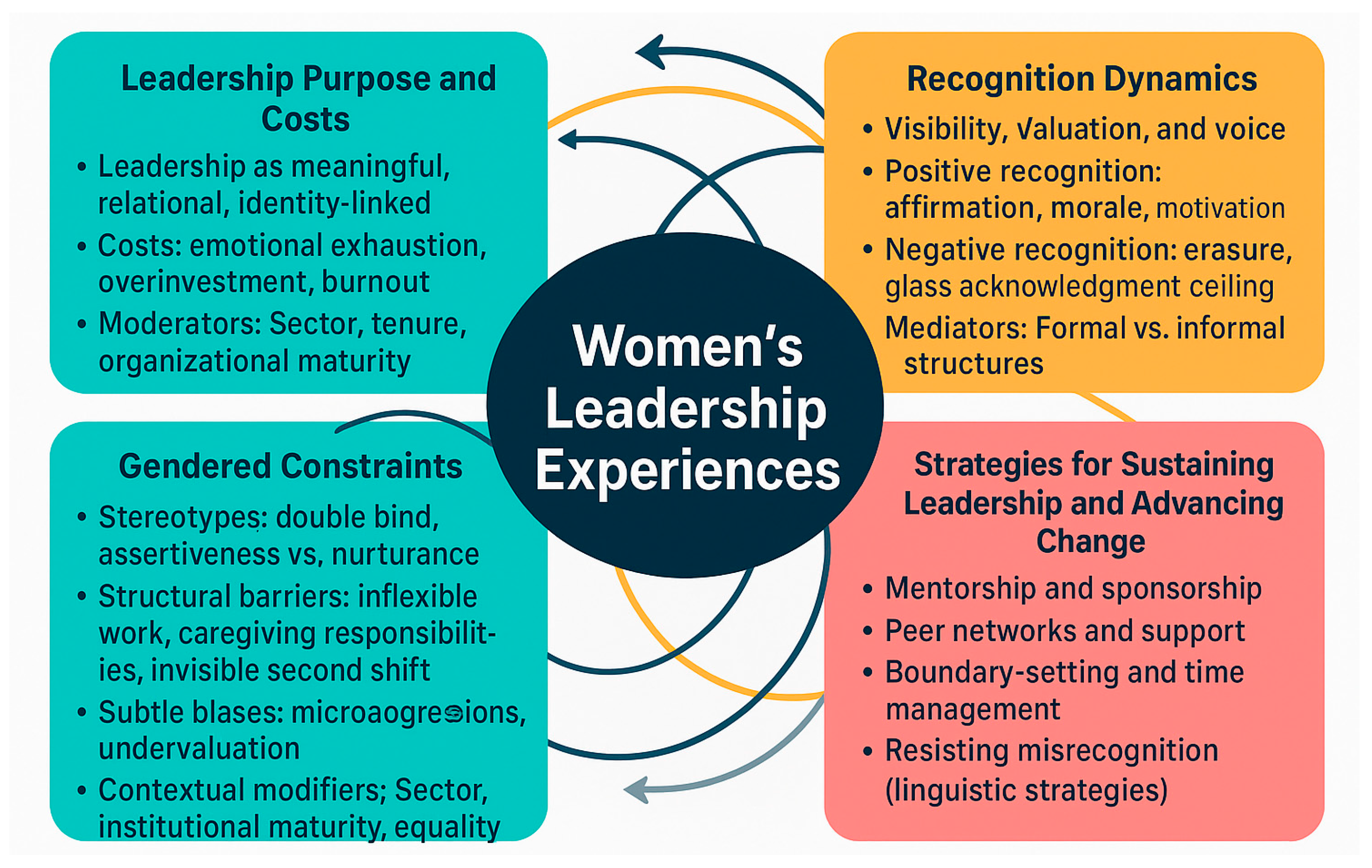 Figure 2) that depicts the dynamic interplay between leadership purpose, recognition, and gendered constraints, mediated by strategies that sustain agency and resilience. In this framework, recognition functions as both affirmation and validation, shaping morale, visibility, and self-concept. Its uneven distribution, shaped by organizational and gendered norms, can intensify feelings of invisibility or undervaluation. Gendered barriers—including stereotypes, microaggressions, and structural inequities—intersect with these dynamics, constraining authority, shaping communication styles, and limiting access to opportunities. Women’s adaptive strategies transform these constraints into actionable agency, fostering both personal sustainability and organizational change. This cyclical system emphasizes that leadership meaning, recognition, and barriers are not isolated factors but continuously interact, with strategies serving as mediating mechanisms that support both individual careers and broader organizational transformation.
