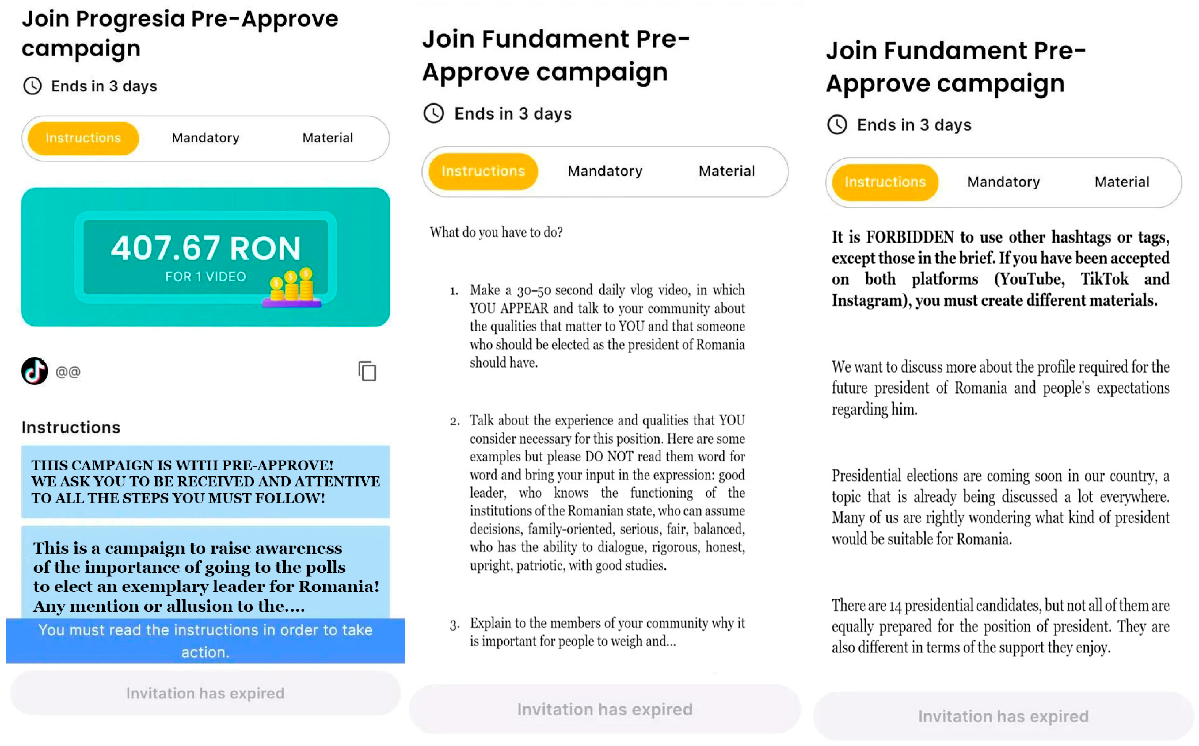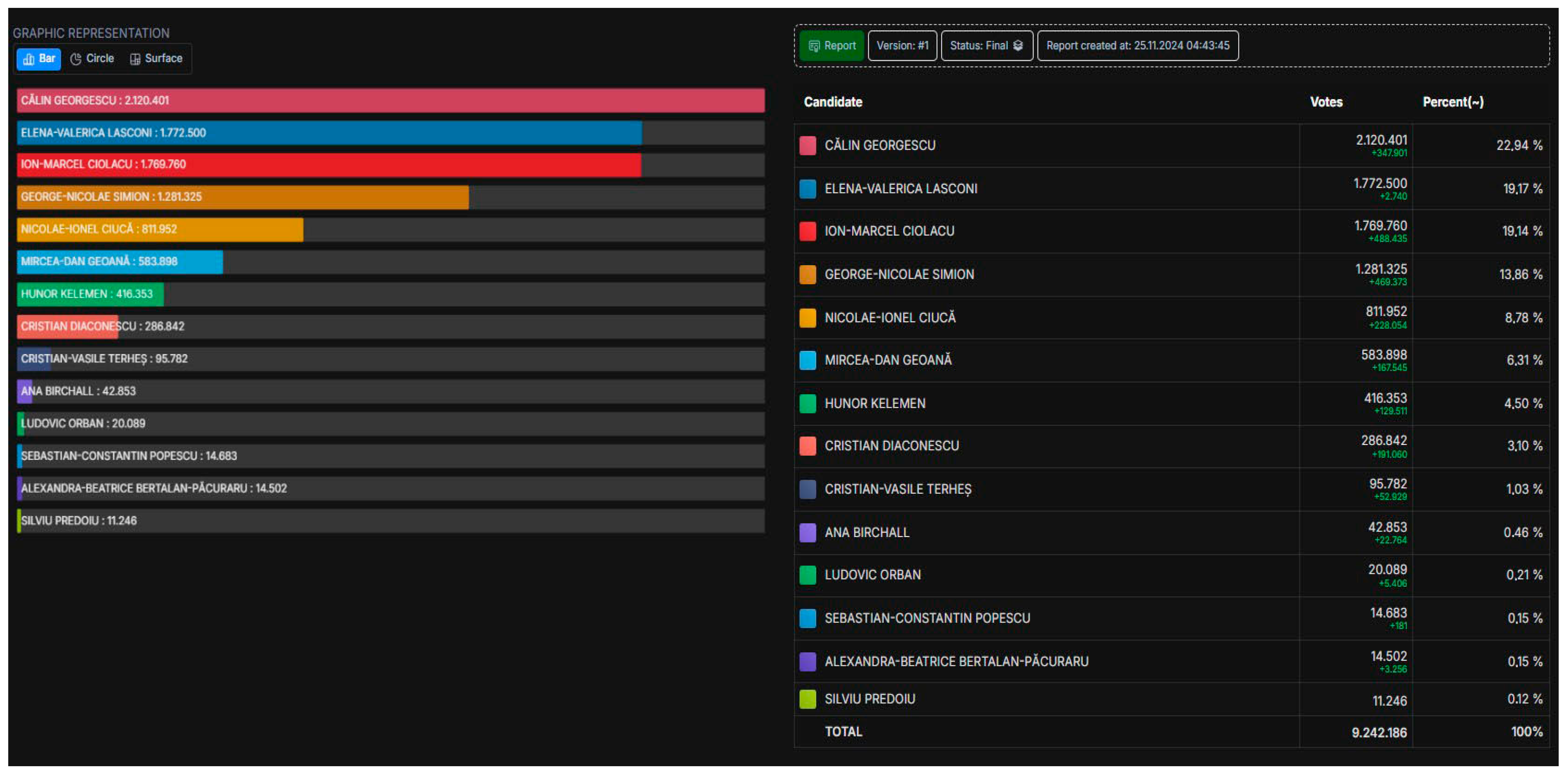 These indicative figures support the claim that social media algorithms, when manipulated, can distort perceived popularity and thereby influence voter behavior. The result of this process is that within 12–24 h, the video material can reach over 1 million views, and this number can influence the real users of the platform in making certain decisions, especially since we are talking about the use of such a tool in manipulating the masses. If we are talking about any content that does not bring information through which to influence certain legislative, governmental, and integrity aspects, we can overlook the speculation of the vulnerabilities of any platform. This time, we are talking about a well-defined architecture, multiple videos that respect a pattern and are based on a set of information that reaches the sensitive side of the users, and keywords that identify the campaign carried out, but more than that, tags that the videos must have are required, these making a direct link with all the videos that the candidate exposes. When a thousand videos in the description contain a viral tag, it is ranked in that platform and can even generate links between content in the same category. Therefore, we can say that in addition to the virtual help generated by the platform, scripting, and programming techniques, the human factor and socio-emotional analysis, direct analysis of discourse, formulation, and expression played an extremely important role in penetrating the target audience. We can say that a favorable environment was created through several techniques, marketing, branding, BigData, programming, neurolinguistic analysis, and mass psychology, but also a discourse that refers to the voice of the people, which has not been listened to at all in the last 35 years, leading to this surprise of the presidential elections in Romania.