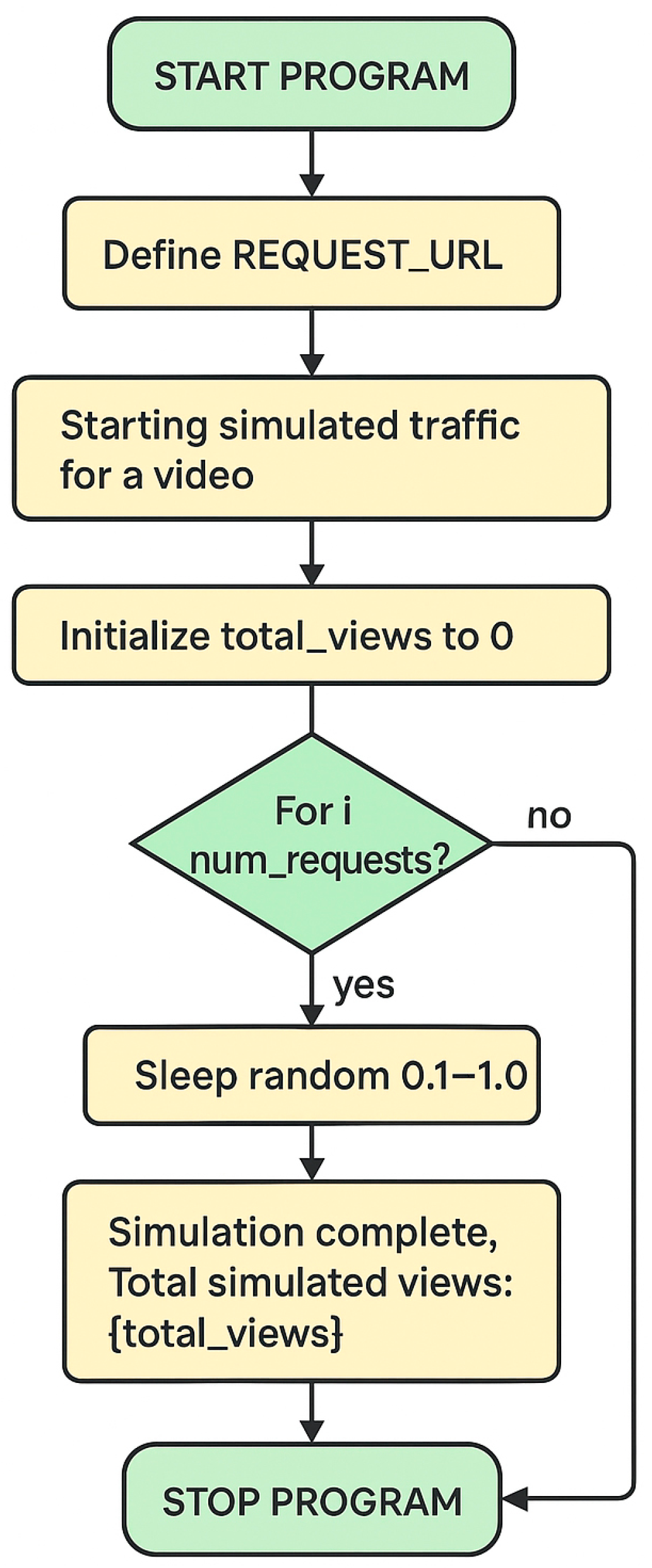 Figure 7 illustrates the high-level control flow of a prototype simulation utility used to study the effects of bursty, concurrent request patterns against a video resource. The diagram shows the principal stages: initialization of configuration parameters (target resource identifier and total request count), entry into the simulation routine, iterative generation of request events, local pacing between events, and termination reporting. The logical structure follows a common producer/worker pattern: a top-level controller establishes experiment parameters, while multiple worker activities execute request events and update shared counters under synchronization. The algorithm accepts two primary inputs, a resource identifier and a nominal request count, and orchestrates a loop that generates the requested number of events. To emulate simultaneous load, the design commonly uses concurrency primitives (e.g., threads or worker pools) together with mutual-exclusion constructs to protect shared state (such as the global view counter). Inter-event delays and randomized pacing are incorporated to produce non-uniform arrival patterns. A monitoring/aggregation step collects per-worker success/failure statistics and prints a summary on completion.