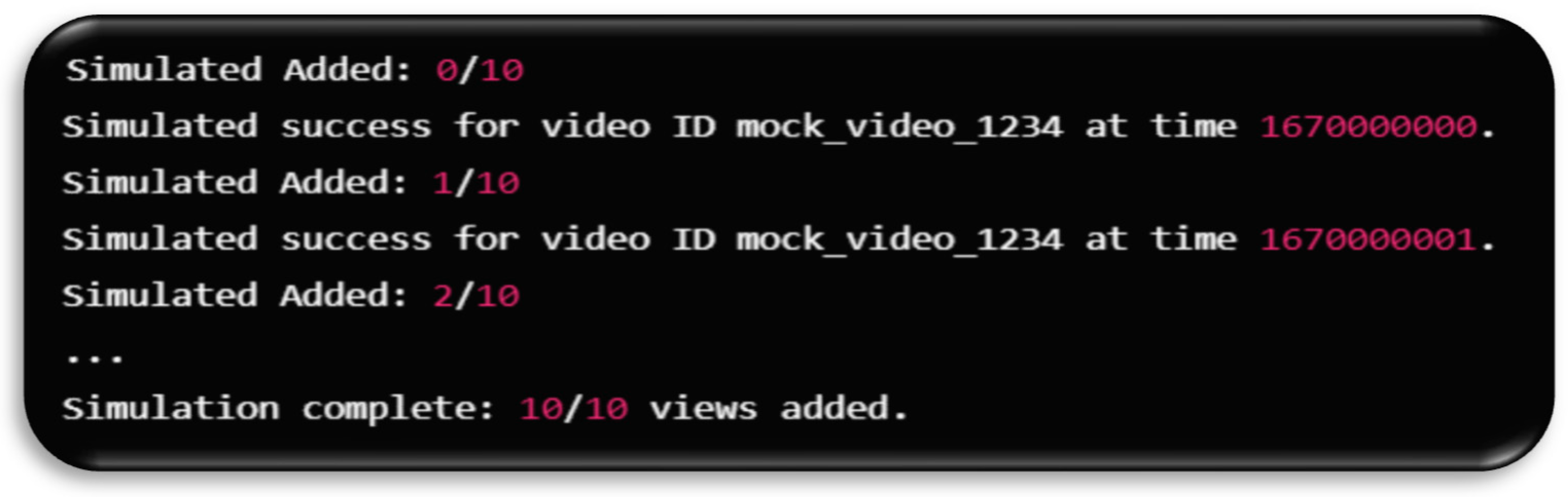 The script successfully generates views for a fictitious video called (mock_video_1234), each iteration being successfully recorded with a timestamp, with each view added, the script notifies the progress status, see the