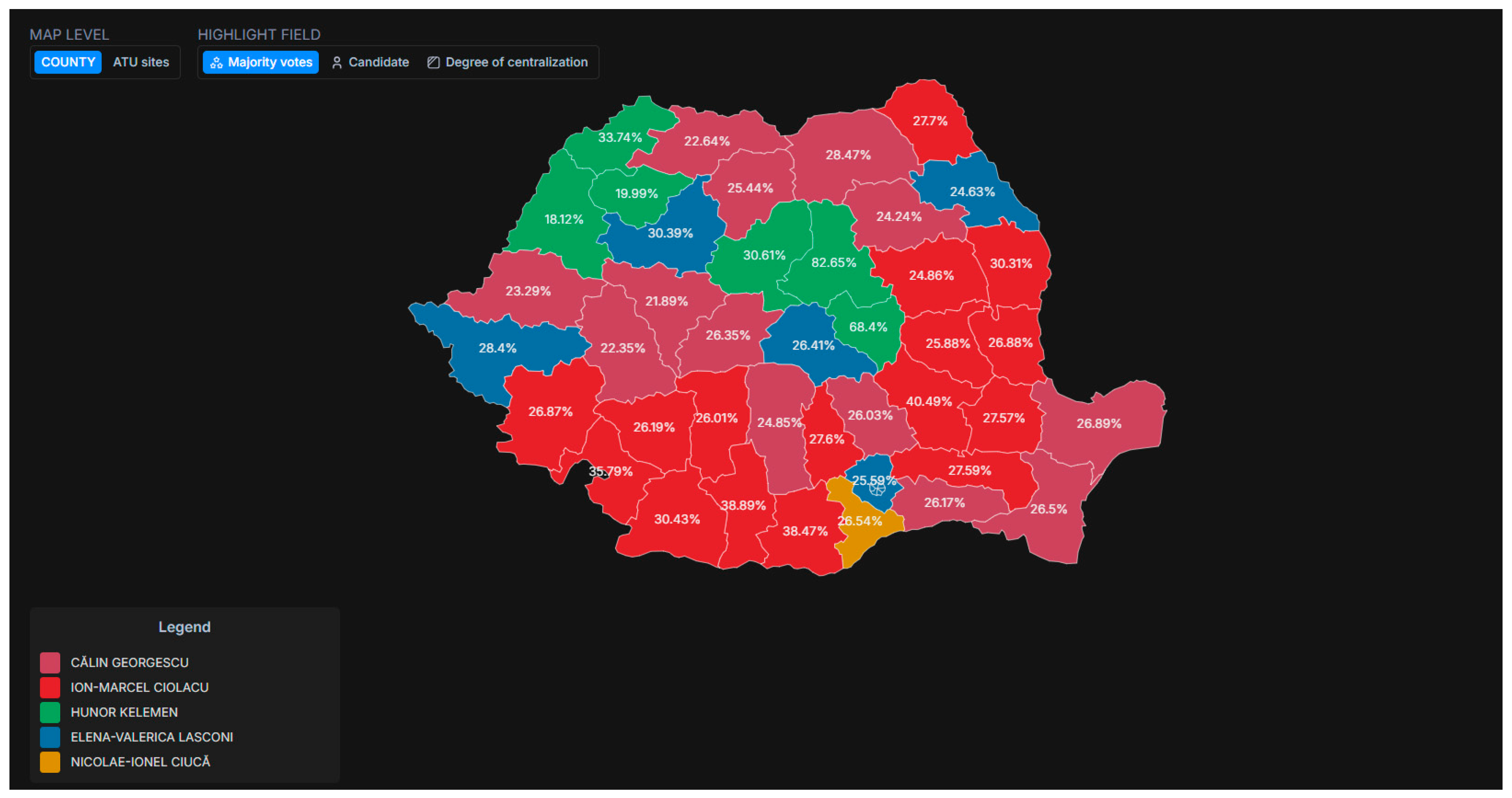 Figure 14 illustrates the geographical distribution of the majority votes across Romanian counties in the 2024 presidential election. It highlights a strong concentration of support for the independent candidate Călin Georgescu (marked in green) in the North-East and central–northern regions of the country, with notably high percentages in counties such as Neamț (68.44%), Botoșani (33.74%), and Bistrița-Năsăud (30.61%).