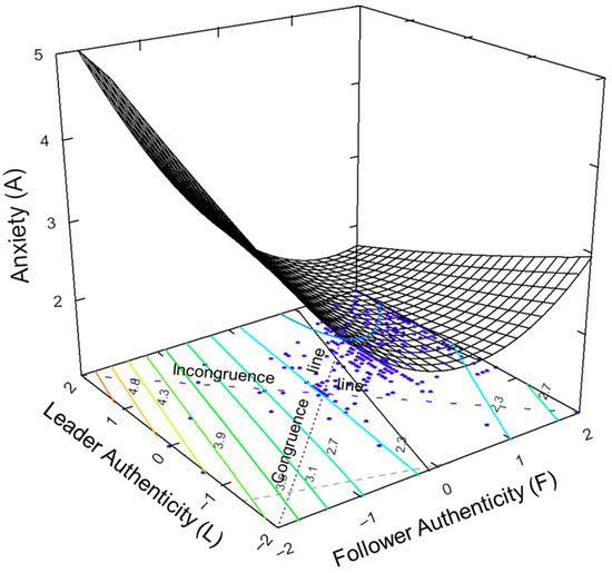 As we mentioned above, the curvature of the congruence line (a2 = 0.135, p = 0.090) was not significant, demonstrating the linear relationship along the congruence line, rather than curvilinear. At the same time, the slope was negative and significant (a1 = −0.536, p < 0.001), supporting Hypothesis 2. Figure 2 visually depicts the negative slope of the plane as it runs from the front corner of the graph to the back corner along the congruence line, indicating that followers’ anxiety levels will be lower when authenticity fit is at high level (high-high) between the leader and follower, compared to when it is in low-low fit.