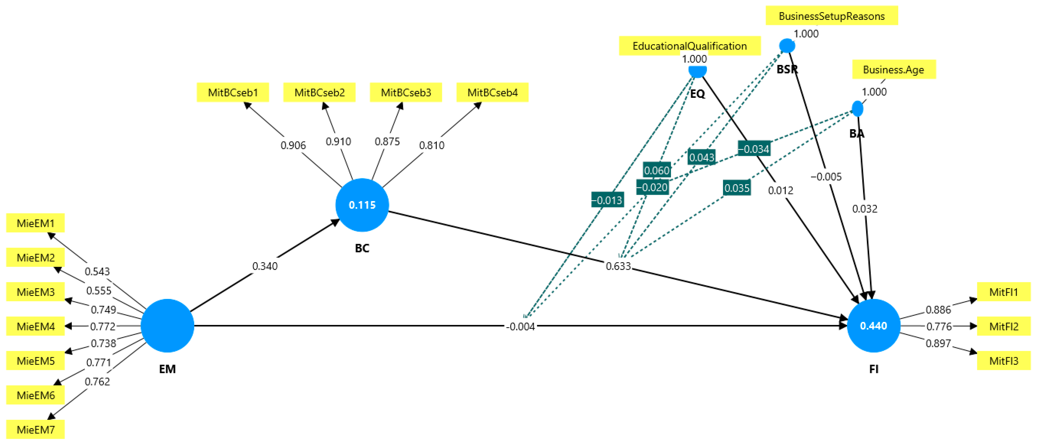 The study demonstrated that behavioral control strongly mediates the link between economic motivation and future intention, evidenced by a positive and statistically significant indirect impact (β = 0.115, p = 0.000), thus corroborating hypothesis H4. In terms of explanatory power, Figure 3 demonstrates that the behavioural control (BC) construct accounts for 11.5% of the model’s variance (R2 = 0.115), reflecting a moderate level of predictive accuracy. This indicates that the exogenous variables in the model collectively explain 11.5% of the variance in behavioural control. While this highlights the model’s relevance, it also suggests that there are additional, unmeasured factors that may influence entrepreneurs’ intentions. For the future intention (FI) construct, the model explains 43.9% of its variance (R2 = 0.439), representing a strong level of predictive accuracy. This result implies that more than half of the variance in loyalty is effectively explained by antecedent variables, particularly the behavioral construct. The high R2 value for future intention (FI) underscores the model’s ability to capture the critical factors driving the informal entrepreneurs’ intentions to transition. (see Table 4 and Table 5 for details). This outcome indicates that economically driven people are more inclined to establish robust future intentions for formal entrepreneurship when they perceive a feeling of control over their activities. Behavioral control functions as a conduit; individuals who see themselves as capable of managing formal business needs are more inclined to convert their financial aspirations into tangible plans.