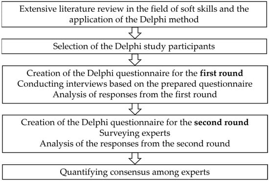 The goal of conducting the Delphi study is to gain a deeper insight into the necessary soft skills of young people and to encourage the development of these skills, which will make it easier for young people to successfully enter the work sphere by getting a job or starting their own business. Since the Delphi study is based on achieving consensus on effective practices and pinpointing areas of divergence, it forms a solid ground for the identification of best practices for youth soft skills development. It requires specification of the number of iterative processes or rounds, experts’ selection, design of procedures to conduct the study and collect answers, and selection of analytical methods that will be used to reach the consensus of experts’ opinion (Figure 1).