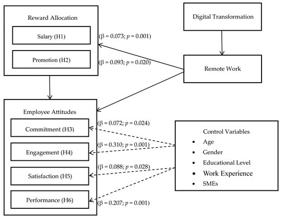 Digital transformation and remote work continue to reshape the nature of work, yet the implications for salaries and promotions in SMEs continue to be poorly understood. This study investigates how reward allocation mediates the relationship between remote work and employee attitudes, addressing the organizational challenges of aligning human resource practices with digitalization work models in the European context based on the social exchange theory and data collected from n = 615 participants, primarily from SMEs, which were analyzed using PLS-SEM software and WarpPLS 7.0. The findings reveal that remote work not only strengthens workers’ engagement and satisfaction but also channels their efforts toward achieving outcomes and reward allocation, reducing the reliance on physical presence and visibility. Digital transformation enables SMEs to adopt more flexible and fairer HR practices, with remote work also contributing to organizational resilience, employee agility, and competitiveness. This research advances the theoretical understanding of HRM in the context of digital transformation, offering SMEs a guide to building a suitable reward system that promotes both individual well-being and sustainability.