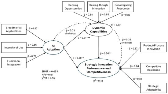Organizational dynamic capabilities mediate and strengthen the relationship between AI adoption and strategic innovation performance and competitiveness. Specifically, AI adoption enhances a firm’s ability to sense opportunities, seize them through innovation, and reconfigure its resources, thereby translating technological adoption into sustained competitive advantage. SMEs with more developed dynamic capabilities derive greater strategic benefits from AI adoption than those with limited capabilities.