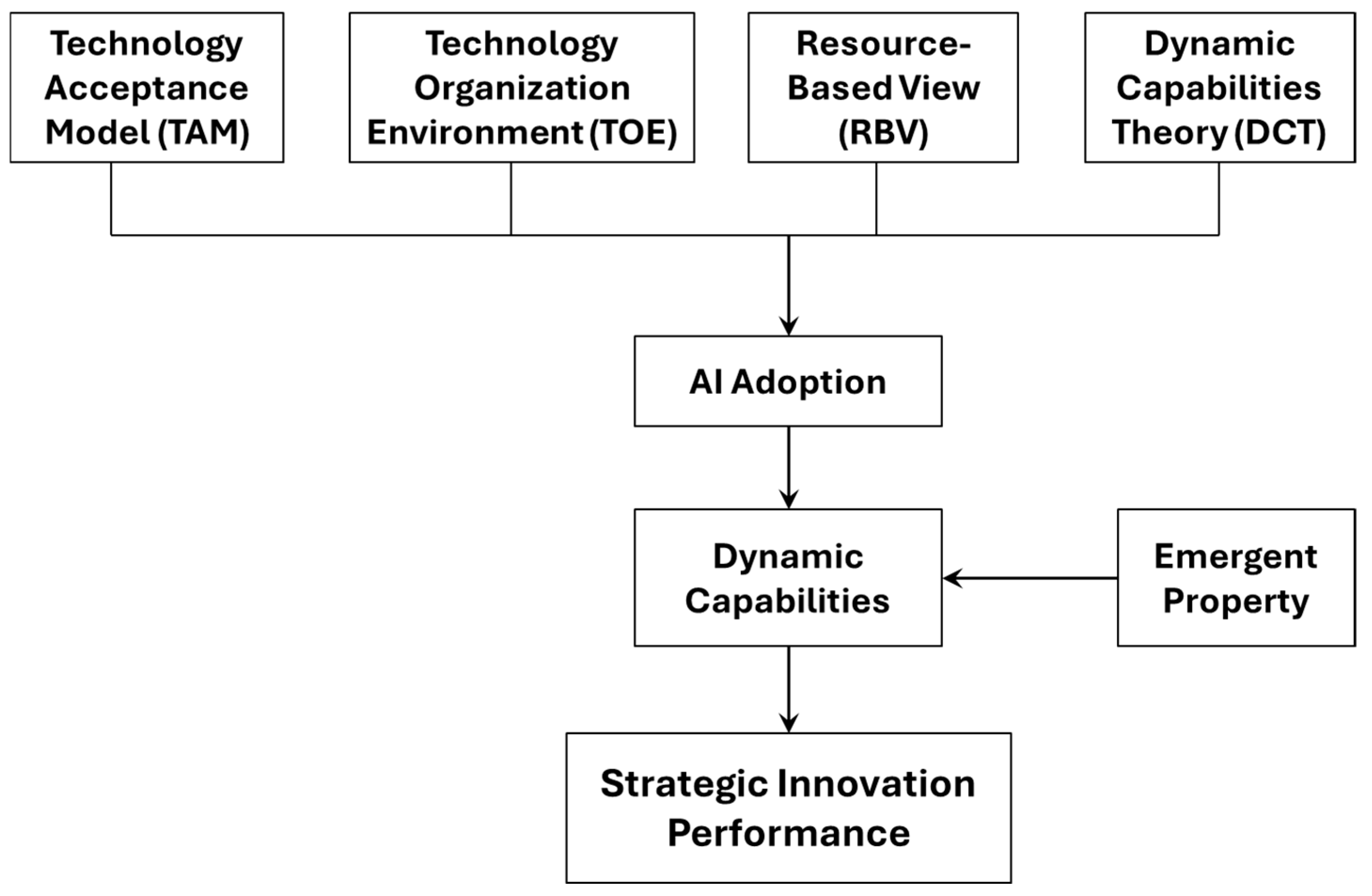 While Dynamic Capabilities Theory explains how firms renew, recombine, and leverage resources to generate performance under uncertainty, it does not fully account for how organizations with limited technological maturity initiate adoption or overcome early-stage constraints. Conversely, models such as TAM and TOE can explain intention and initial decision-making but cannot describe how post-adoption learning and reconfiguration processes unfold. This asymmetry indicates that no single framework can explain the complete pathway linking adoption, capability development, and strategic outcomes in resource-constrained SMEs. The integration of these perspectives is therefore not additive but necessary to capture the sequential and interdependent processes through which firms begin experimenting with AI and progressively build the adaptive routines that underpin strategic innovation.