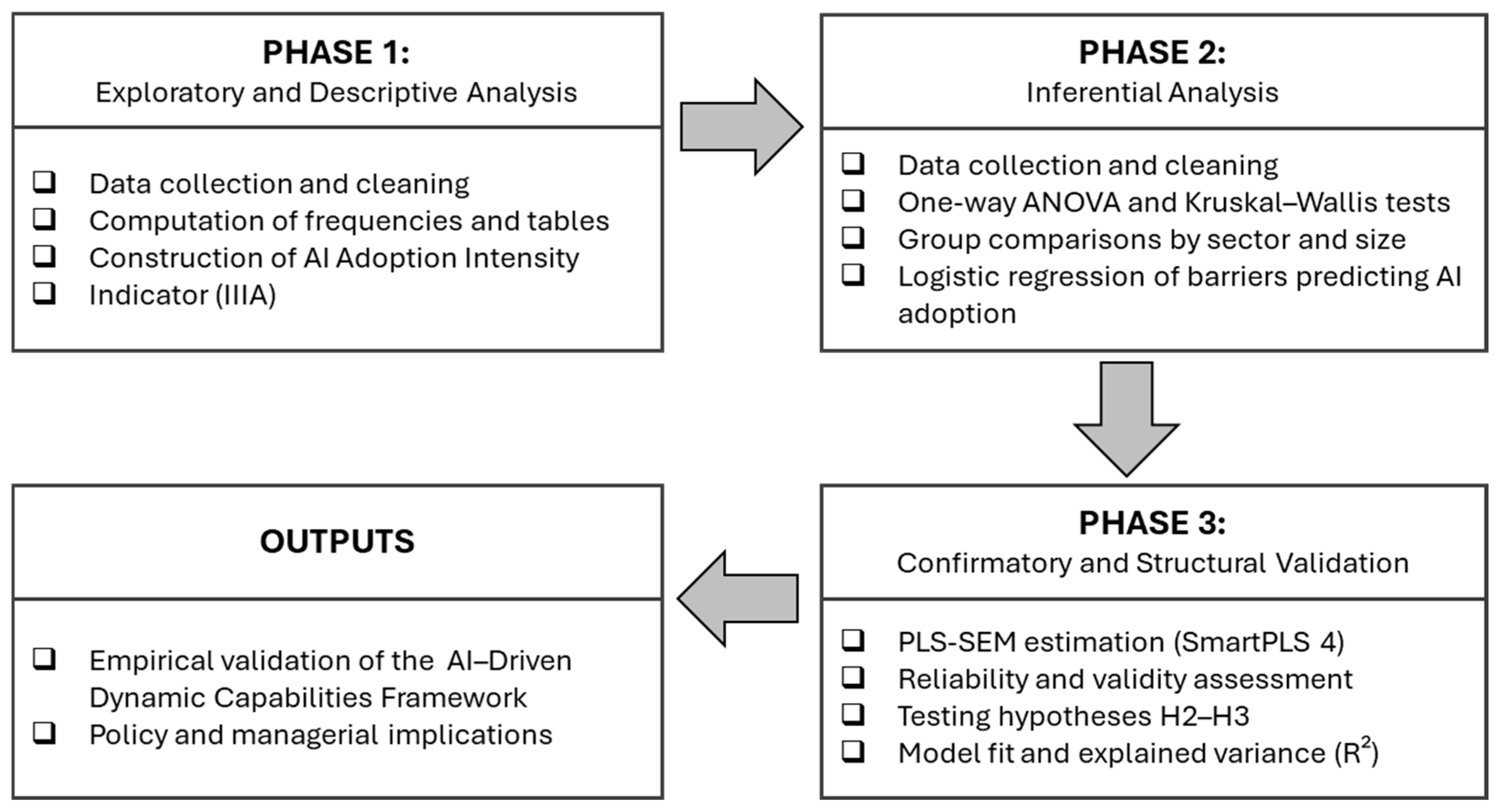 This study has several limitations that offer opportunities for future research. First, its national focus constrains external validity. Although the findings provide valuable evidence from an underexplored Latin American context, they reflect Ecuador’s structural characteristics—such as the predominance of microenterprises and pronounced digital divides. The nationally representative sample of 385 firms cannot be generalized to all emerging economies. Future studies should therefore incorporate multi-country and cross-regional comparisons to examine whether the AI adoption–dynamic capabilities–innovation relationships identified here hold under different institutional and technological conditions (