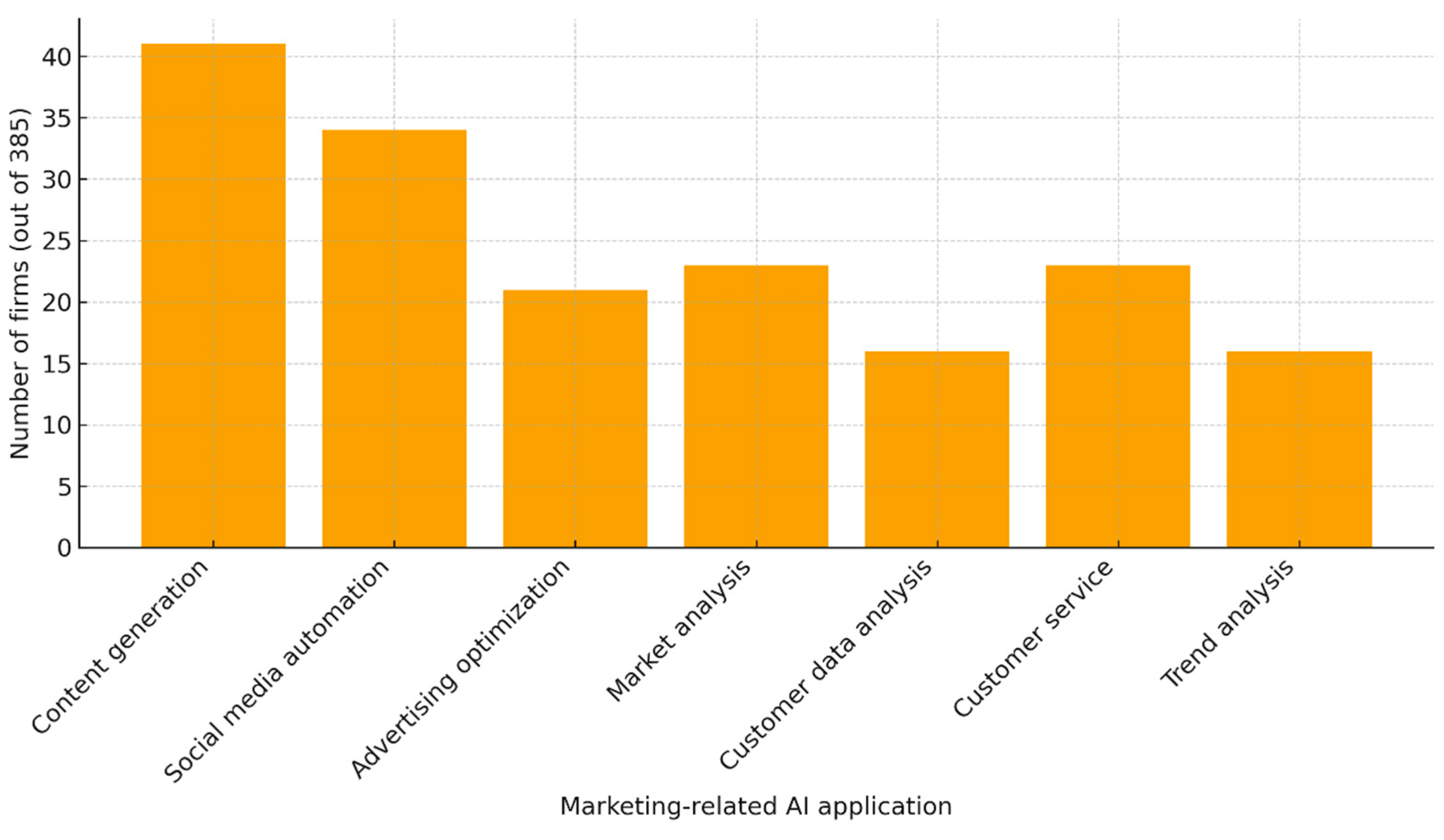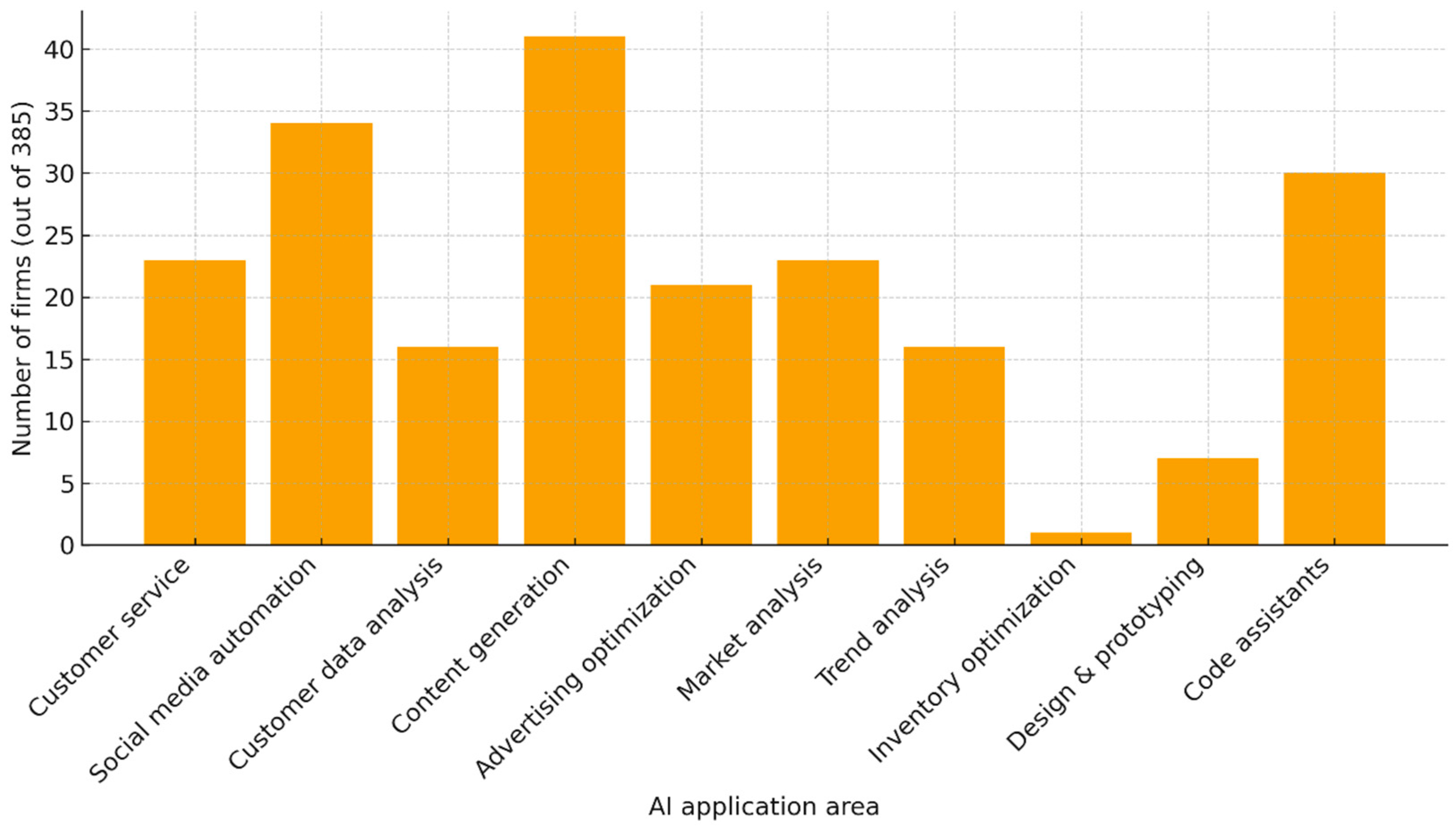 Service and commerce firms show higher adoption of marketing-related AI (≈12–13%) than industrial firms (≈4%). At the same time, inventory optimization and prototyping are concentrated in the industry and IT sectors, explaining the observed sectoral effect. For other applications (e.g., customer service, advertising, analytics), sectoral differences were nonsignificant (p > 0.05), indicating uniformly low adoption across industries.
