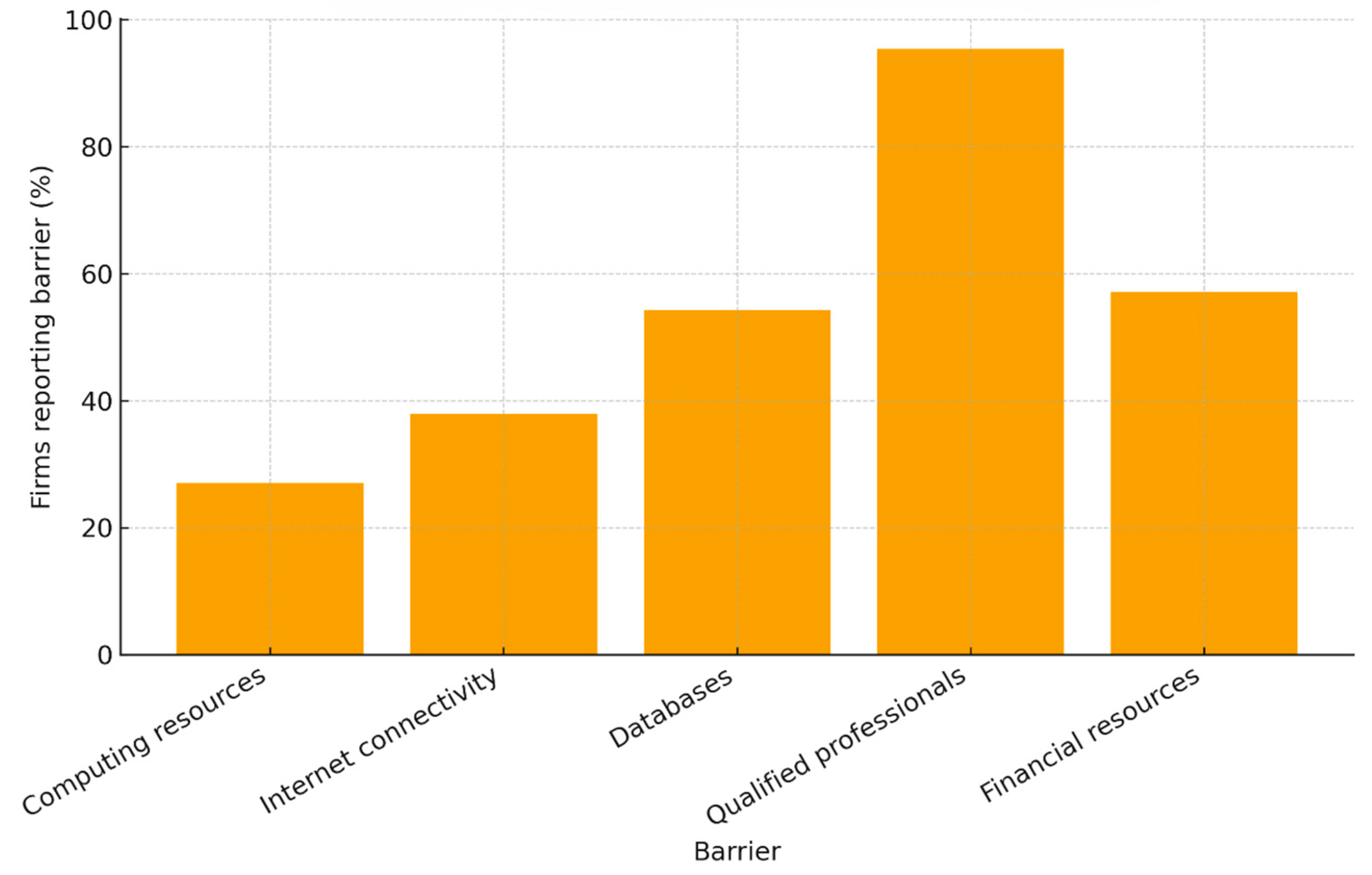 Most barriers—notably shortages of skills and financial resources—are pervasive, though specific constraints such as computing infrastructure and data availability differ by context. These results indicate where policy and managerial efforts could be most effective: improving digital infrastructure in non-technical sectors and strengthening data-management capabilities in growing firms to close the adoption gap.