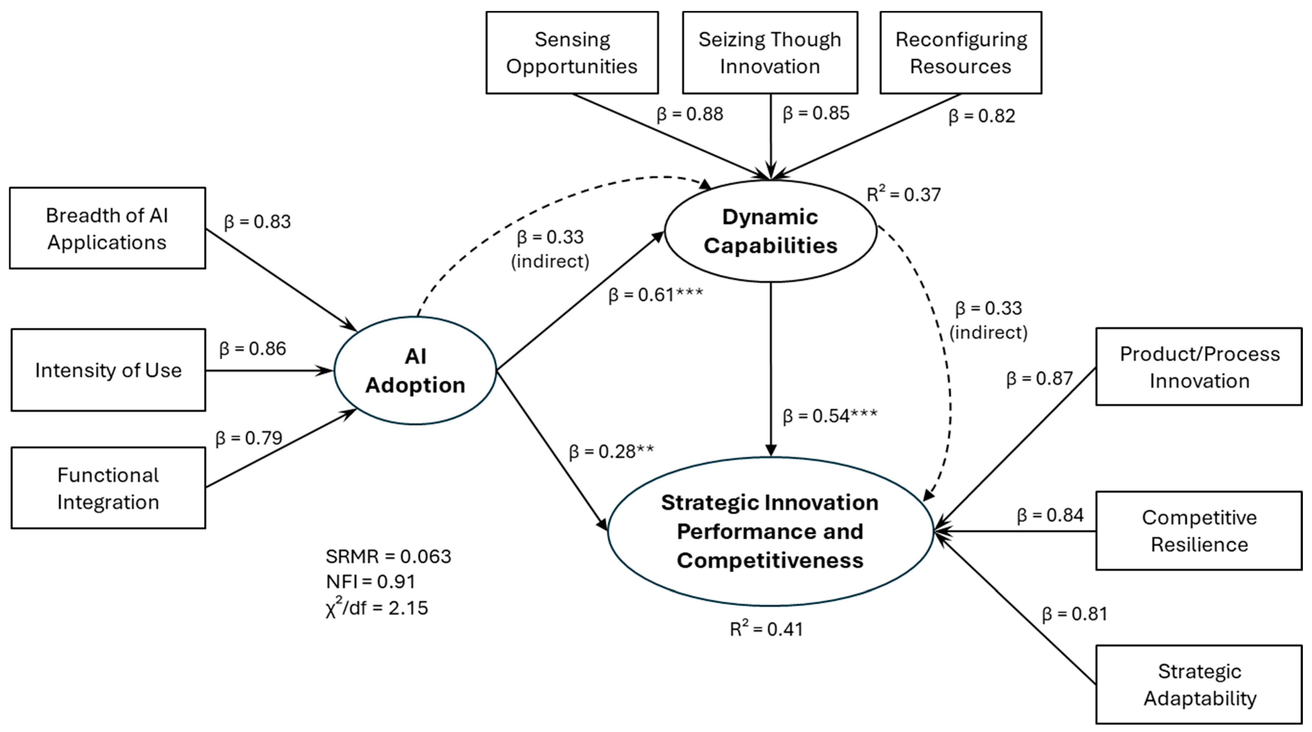 β = 0.33, 95% CI [0.17, 0.50]), confirming partial mediation. The model explains 41% of the variance in Strategic innovation performance and competitiveness (