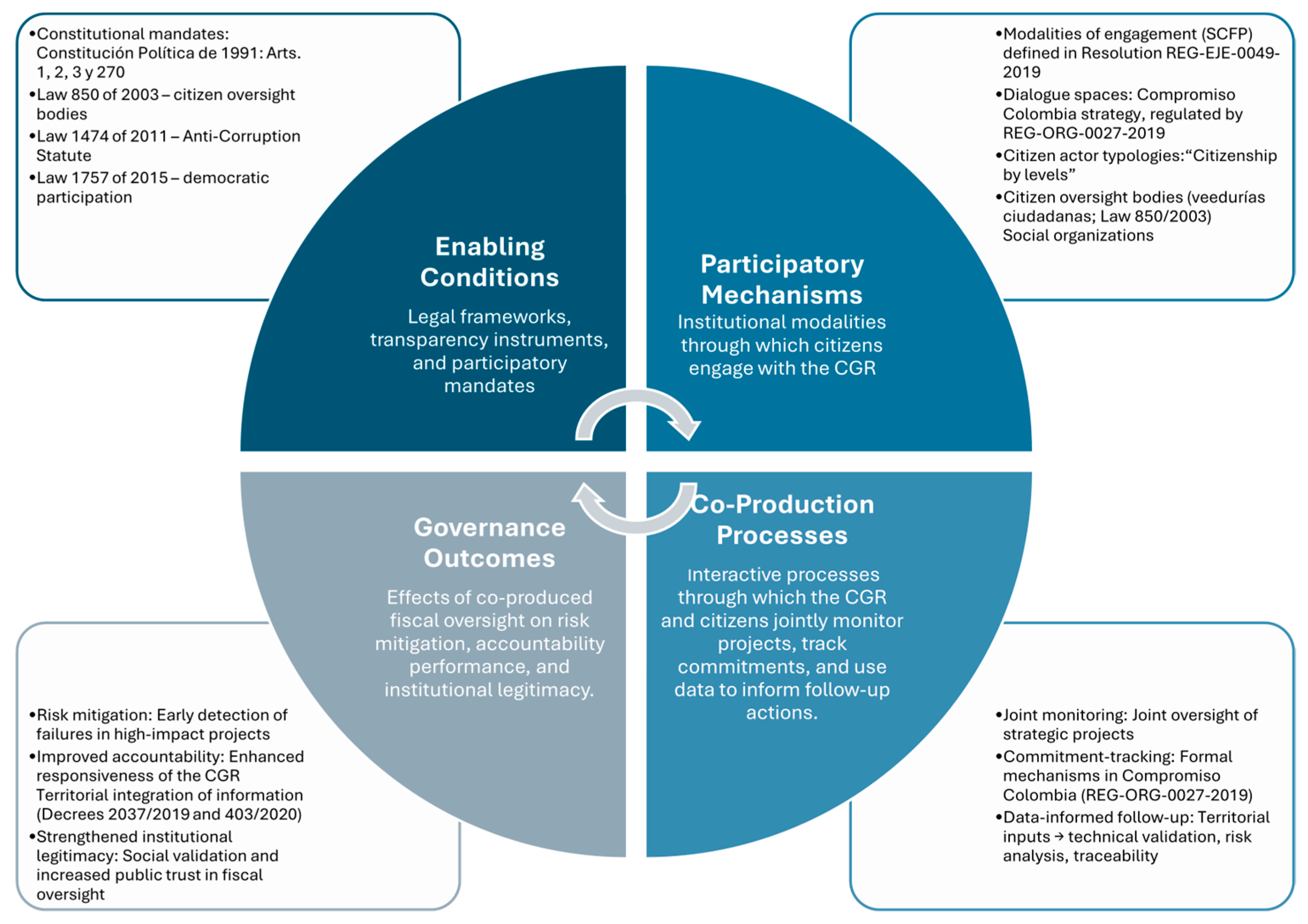 Contraloría General de la República, 2019b) further operationalizes this architecture by establishing Compromiso Colombia as a structured co-governance mechanism. Through institutionalized dialogue spaces, risk-prioritization tools, and collaborative follow-up actions, the resolution enables a systematic integration of citizen-generated information into the identification and resolution of implementation barriers affecting high-impact public projects. Analytically, this moves participation beyond normative discourse or symbolic consultation; instead, it frames citizen engagement as a governance instrument capable of modifying oversight trajectories, influencing administrative responsiveness, and expanding the informational base upon which fiscal control decisions are made. Complementarily, Decree 2037 of 2019 (