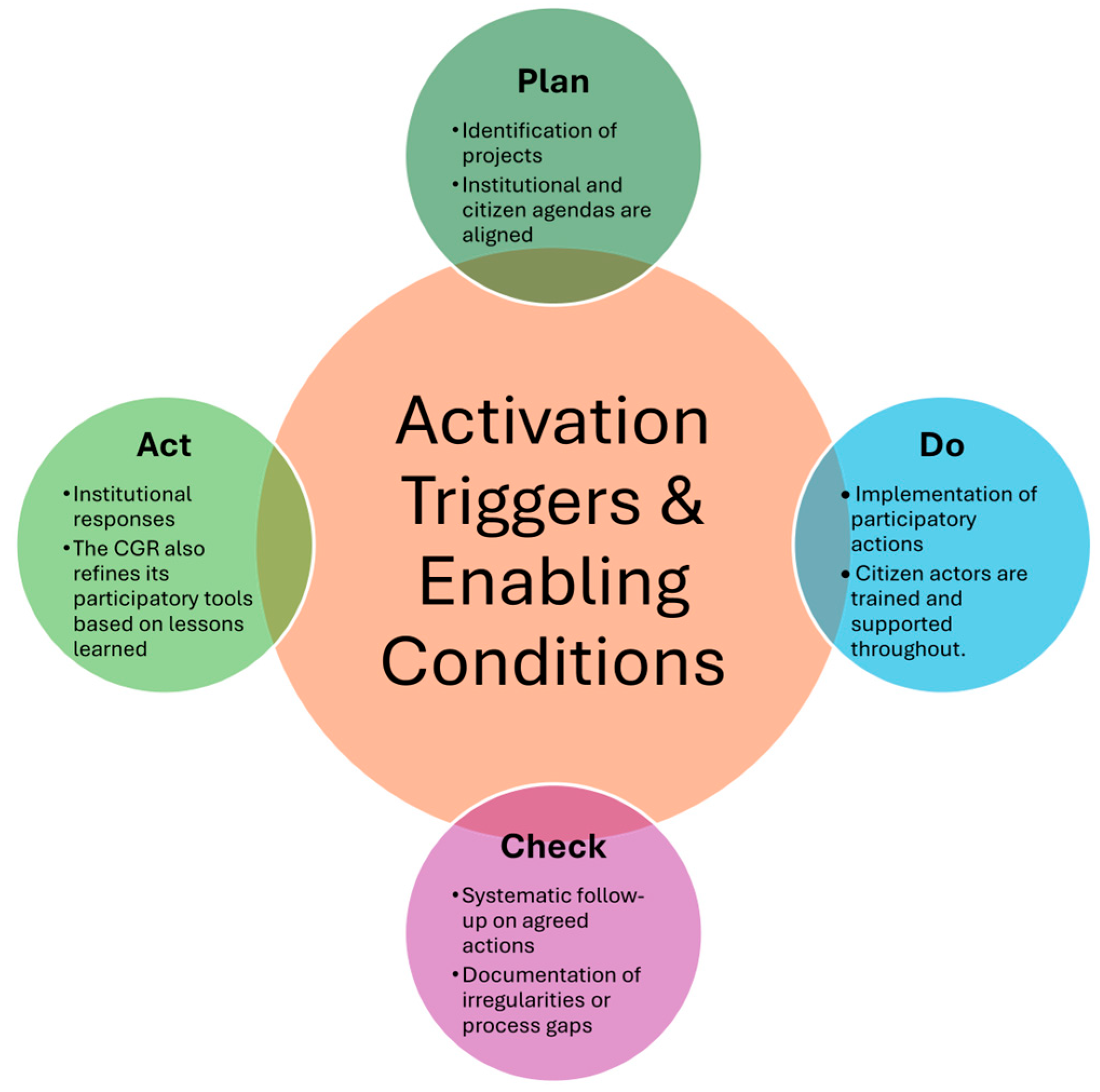 Figure 2 shows how the CGR adopted a PDCA cycle (Plan–Do–Check–Act) adapted to participatory oversight to operationalize the system. Participation in the SCFP is activated by triggers such as social complaints, media alerts, risk analysis results, or CGR prioritization. Once activated, the CGR guarantees enabling conditions for citizen engagement through technical–legal support, open access to information, and mechanisms for dialogue. The model is inclusive, adaptable to regional contexts, and sensitive to the capacities of different types of citizen actors.