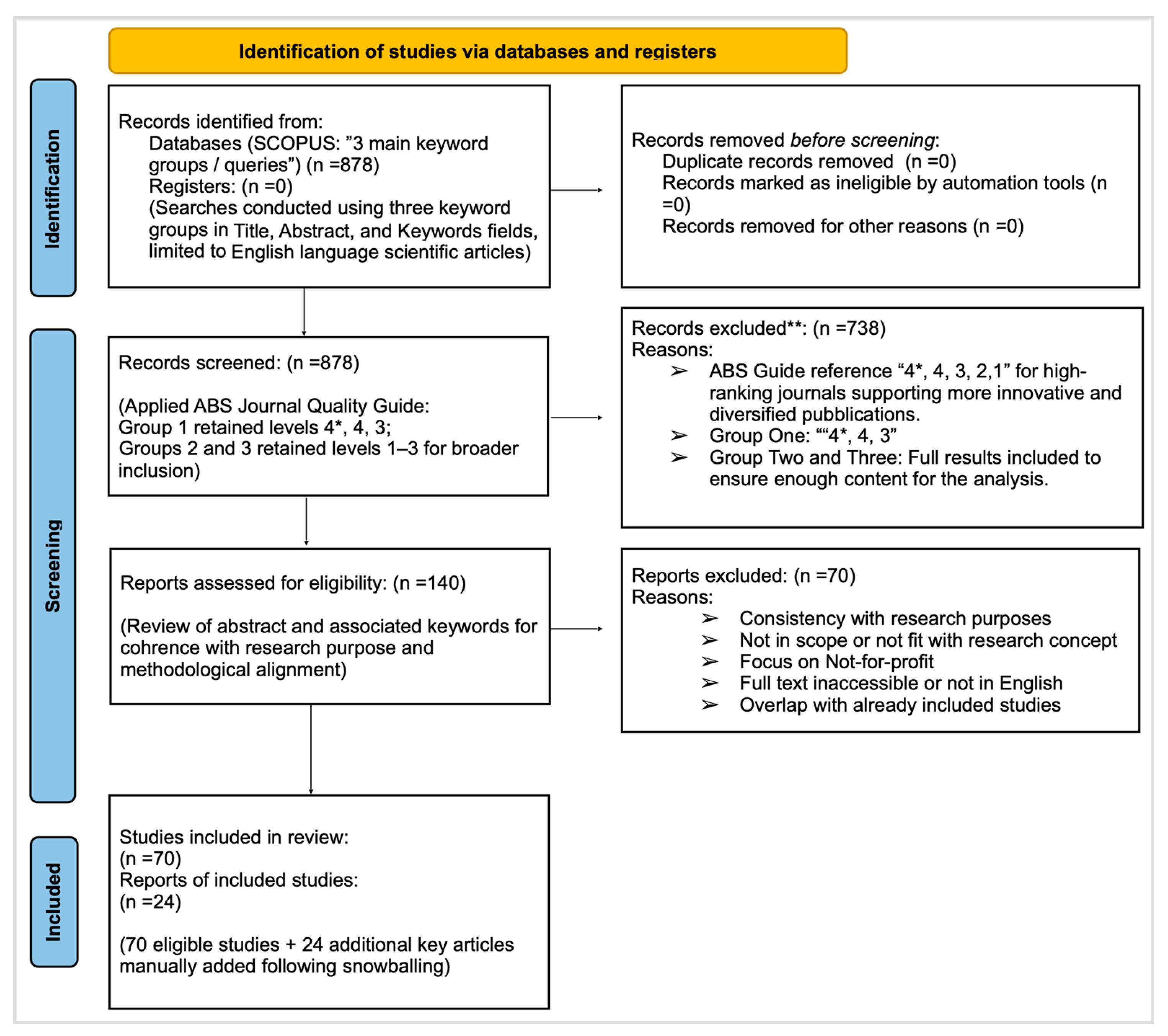The first records were identified based on the presence of a desired set within the title, abstract, and keywords provided by authors or journals, selecting only scientific articles in the English language. The final search was conducted in January 2025. Subsequently, to ensure the quality of the review, we used the ABS Guide to Academic Journals as a benchmark for journal classification and filtered the results based on the ABS guide, inspired by the idea that high-level journals are considered more innovative, interdisciplinary, and diverse (Vogel et al., 2017). This choice differentiates our approach from previous work (Dimitrov, 2022) which included more practitioners’ releases and not rigorous publications. This principle has been used in previous ExO studies (Marchese et al., 2020).