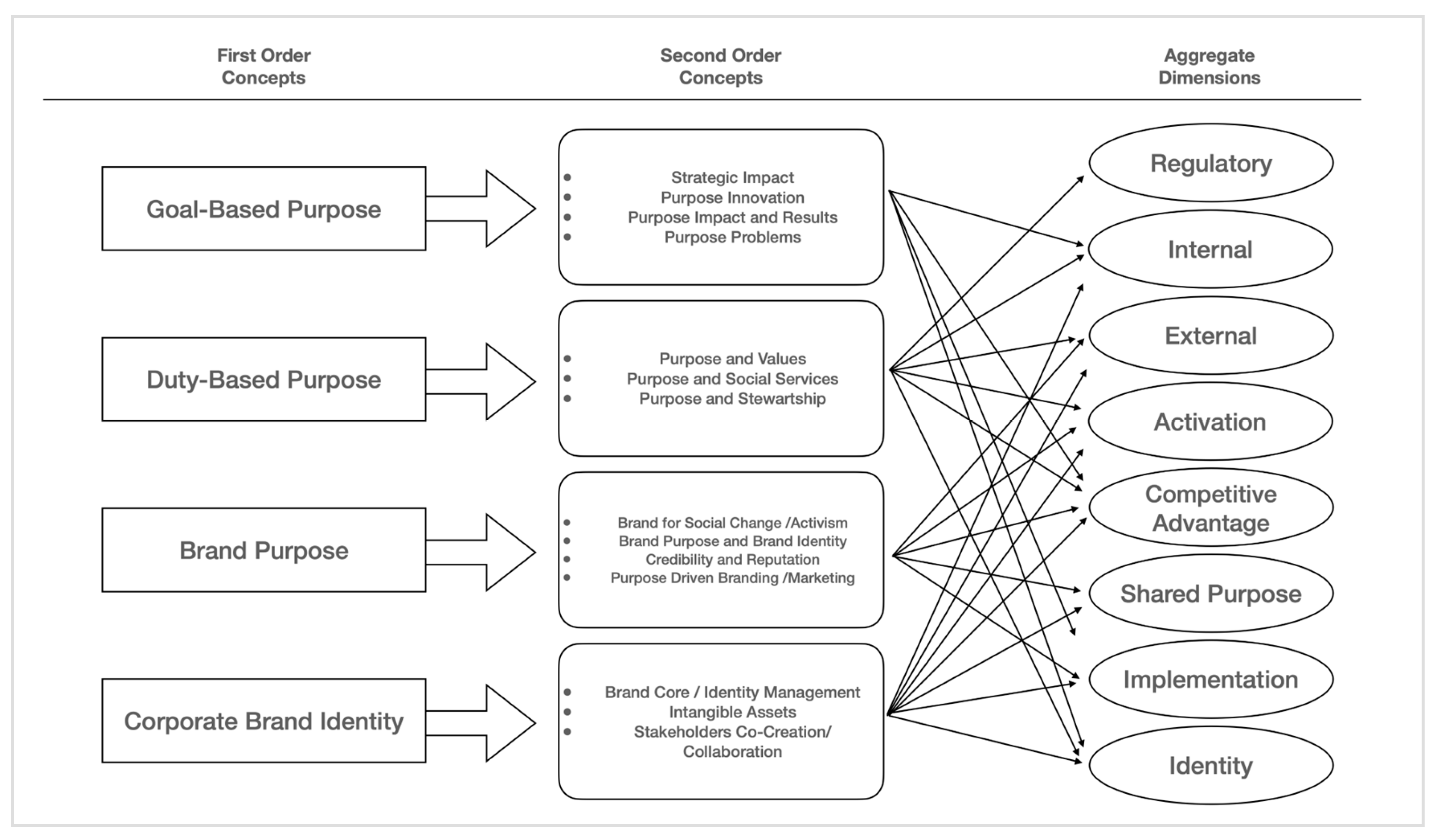 Following the above-mentioned analysis, conducted using the PRISMA integrative approach to literature reviews (Page et al., 2021), the following two main themes emerged: the MTP as a concept and a management tool. Furthermore, the different search results were analysed, leveraging Gioia’s systematic methodology (D. A. Gioia et al., 2013). This process allowed for the identification of a first order of the following purpose-related concepts: Goal-Based, Duty-Based, Brand Purpose, and Corporate Brand Identity. Next, from the analysis of each concept, we identified specific second-order concepts. The final step involved the identification of eight aggregate dimensions.