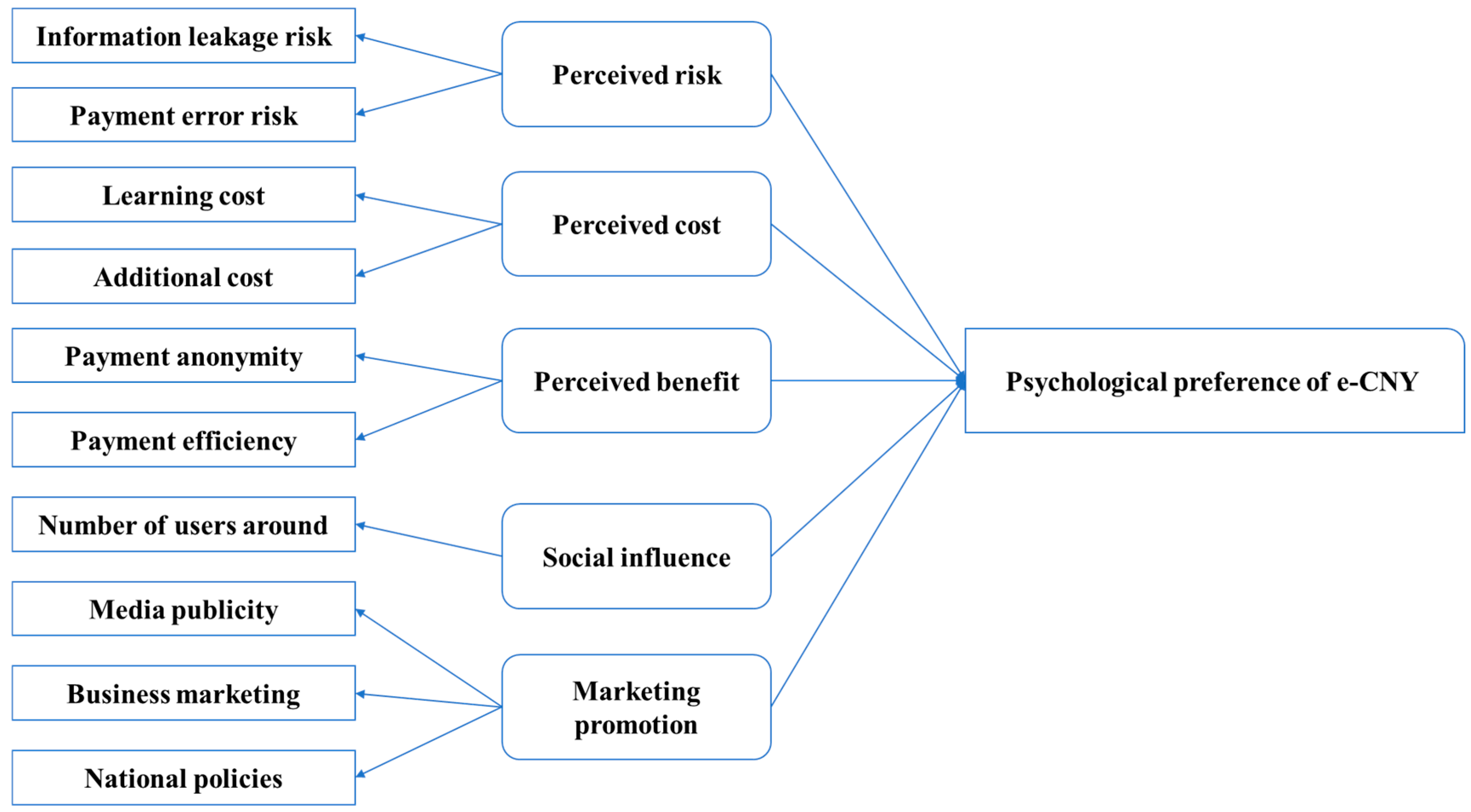 To understand consumers’ preferences for e-CNY deeply and intuitively, this paper designed a questionnaire, mainly for individual consumers (companies, schools, and institutions are not considered). Based on the literature, this paper used UTAUT to investigate consumers’ willingness and psychological preference for e-CNY through five dimensions: perceived risk, perceived cost, perceived benefit, social influence, and marketing promotion.