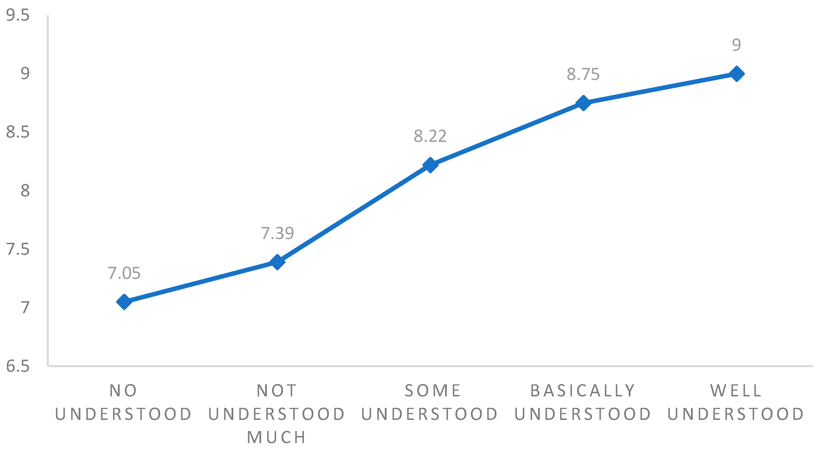 In terms of gender, men’s understanding of e-CNY is slightly higher than women’s, with a score of 5.84 for men and 5.38 for women. Young people have a deeper understanding of e-CNY, with little difference between income groups. In terms of educational level, the understanding score of those with doctoral and master’s degrees is the highest, 5.80, followed by undergraduates, 5.66. The understanding score of high school graduates is 5.14, and the understanding score of junior high school and below is 4.29, showing that the higher the education level, the higher the understanding of e-CNY. From the point of view of whether it is a pilot area, the understanding degree of the respondents in the pilot cities was 5.96, and that in the non-pilot areas was 5.26. The understanding of e-CNY among the respondents in the pilot cities was 0.7 higher than that in the non-pilot areas.