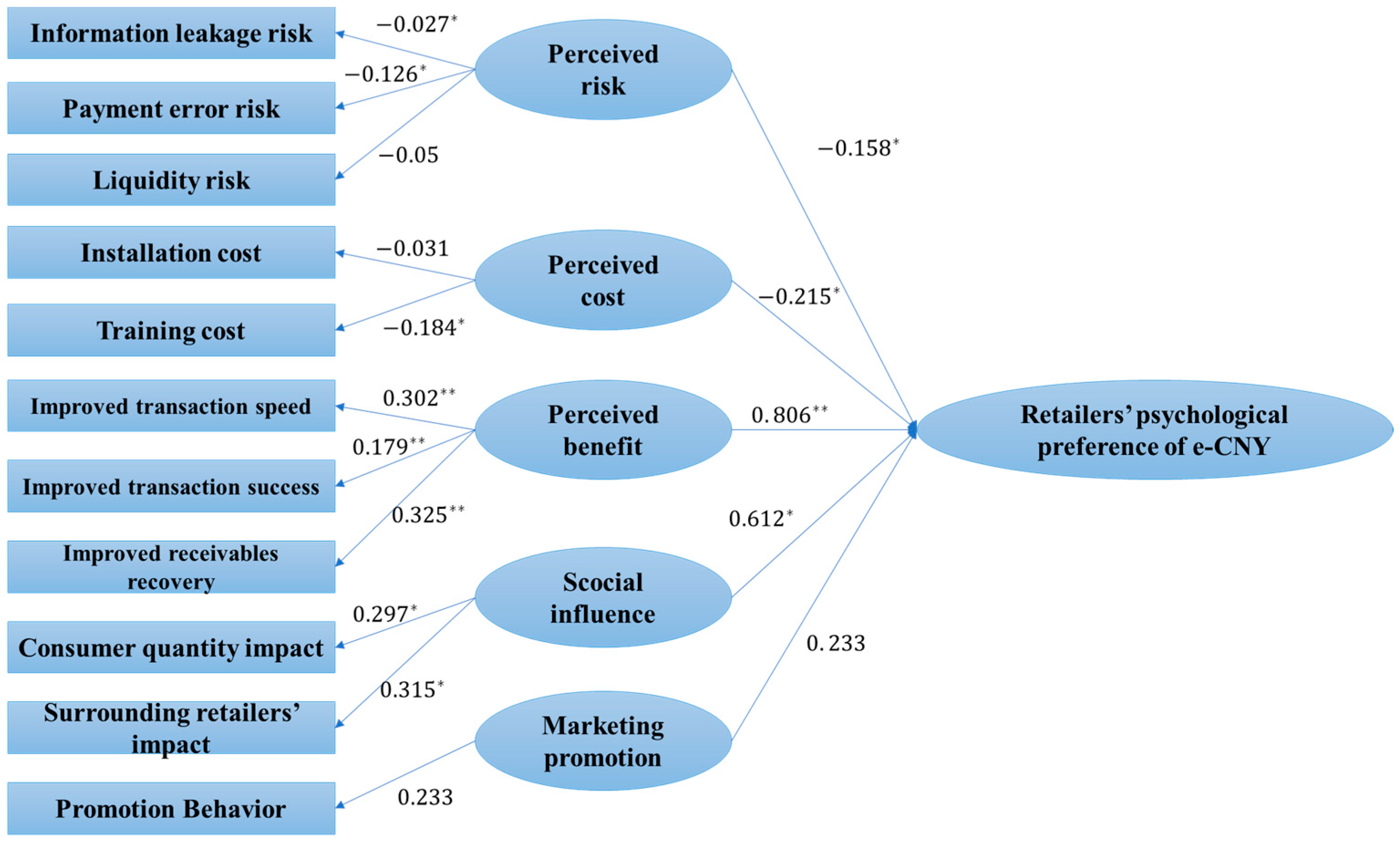 For Retailers, decisions demonstrated greater commercial rationality and competitive awareness. The ease and convenience of digital currency are significant factors in its usage. They are significantly concerned about the risk of financial loss and are sensitive to potential costs, especially training costs, associated with using digital currency. Social influence, particularly the usage among surrounding businesses, has a notable impact on retailers’ willingness to adopt digital currency, with the influence of surrounding businesses being greater than that of consumer usage numbers. Similarly to consumers, marketing promotion does not significantly affect retailers’ willingness to adopt digital currency.