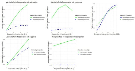 Marketing innovation has a strong direct association with value co-creation (OR = 2.276; p < 0.01), indicating that firms introducing marketing innovations have markedly higher odds of engaging in co-creation than non-innovators. In addition, the interaction between entrepreneurial ecosystems and marketing innovation (H2) is positive and significant (OR = 1.187; p < 0.01), showing that ecosystem cooperation is more strongly associated with value co-creation among firms that innovate in marketing. At the disaggregated level, the interaction terms show that marketing innovation amplifies the positive effects of cooperation with universities (H2a: OR = 1.314; p = 0.038), customers (H2b: OR = 1.602; p = 0.002) and suppliers (H2c: OR = 1.785; p < 0.01). In other words, for firms that innovate in marketing, partnerships with knowledge-intensive and market-oriented actors translate more strongly into value co-creation. By contrast, the interaction between cooperation with consultants and marketing innovation (H2d) is not statistically significant (OR = 1.187; p = 0.268), suggesting that marketing innovation does not systematically reinforce the co-creation effect of consultant relationships. The interaction with competitors (H2e) is positive and significant (OR = 2.313; p = 0.002), indicating that, when present, marketing innovation can considerably intensify the co-creation returns of cooperative arrangements, although such cooperation remains relatively uncommon. The moderating effect of marketing innovation on cooperation with government (H2f) is not significant (OR = 1.270; p = 0.413), implying that policy-related partnerships do not become more co-creation-oriented simply because firms engage in marketing innovation. Figure 2 illustrates how entrepreneurial ecosystem integration and cooperation with universities, customers, suppliers and government relate to the probability of value co-creation in SMEs, comparing firms with and without marketing innovation.